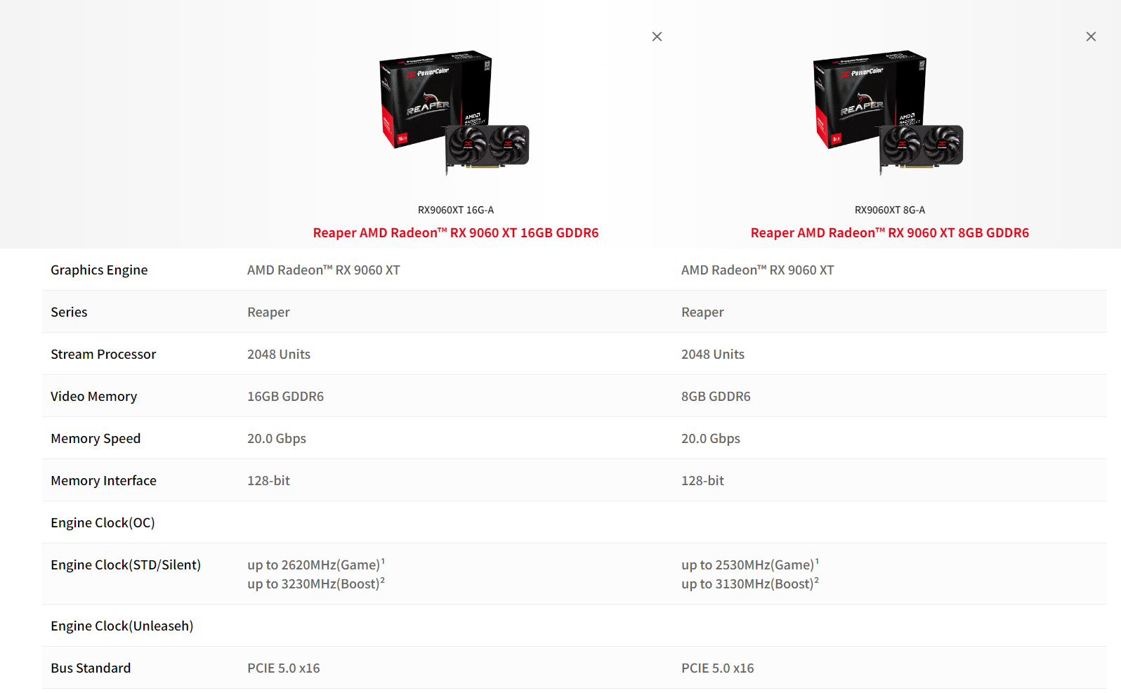 Jednak najciekawsza i nieco zaskakująca informacja to fakt, że nie tylko ilość pamięci różni te modele, ale również taktowania GPU. Modele z 16 GB pamięci mają wyraźnie wyższe zegary niż ich 8 GB odpowiedniki. Przykładowo, karta PowerColor Reaper RX 9060 XT 16 GB osiąga zegar boost na poziomie 3,23 GHz i zegar w trybie gry 2,62 GHz, podczas gdy wersja 8 GB ma odpowiednio 3,13 GHz i 2,53 GHz. Różnica wynosi więc około 90-100 MHz, co może przełożyć się na zauważalnie lepszą wydajność w grach.