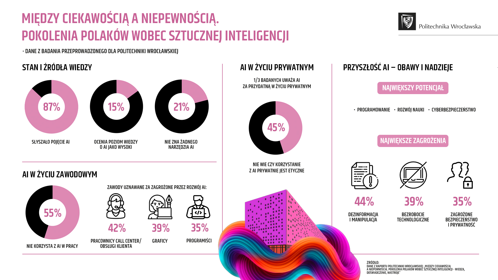 Z jednej strony pokładamy w AI ogromne nadzieje, widząc jej potencjał w medycynie, rozwoju nauki czy cyberbezpieczeństwie. Z drugiej, boimy się dezinformacji (44% obaw) i bezrobocia technologicznego (39%). Kwestie etyczne i prawa autorskie do treści generowanych przez AI dla wielu pozostają na razie poza obszarem zainteresowania.