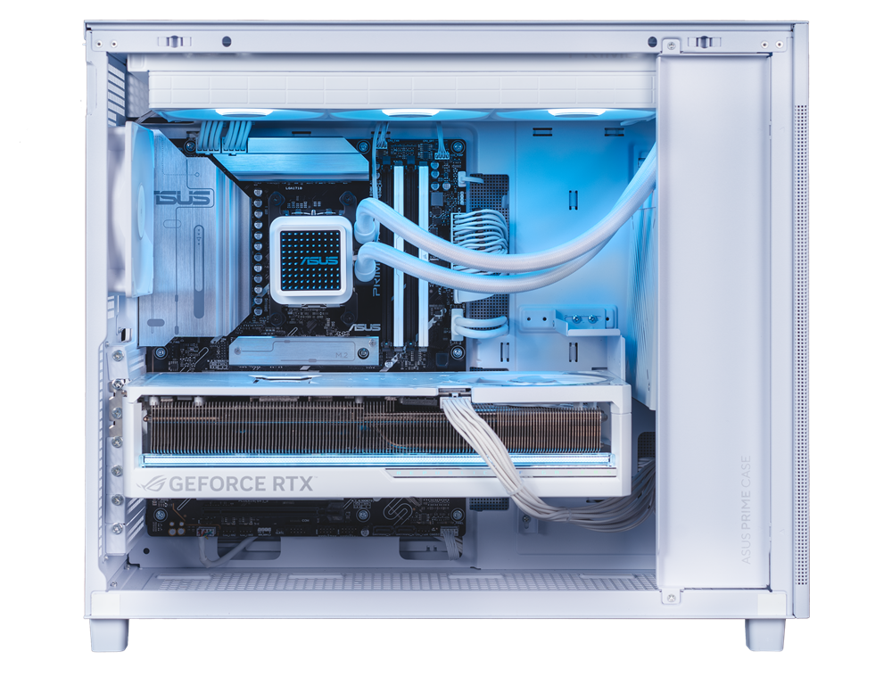 Tu jednak pojawia się najciekawszy detal inżynieryjny. ASUS wie, że dzisiejsze (i przyszłe) karty graficzne są nie tylko długie, ale i absurdalnie ciężkie. Dlatego Prime AP303 wyposażono we wzmocniony, zintegrowany wspornik dla GPU. Producent zapewnia, że uchwyt został zaprojektowany z myślą o utrzymaniu ciężaru modeli z nadchodzącej serii NVIDIA GeForce RTX 50 (o długościach 310-360 mm), w tym nawet tak potężnych konstrukcji, jak ROG Astral GeForce RTX 5090. To gwarancja, że kosztowny sprzęt pozostanie stabilny, a slot PCIe na płycie głównej nie ulegnie uszkodzeniu.