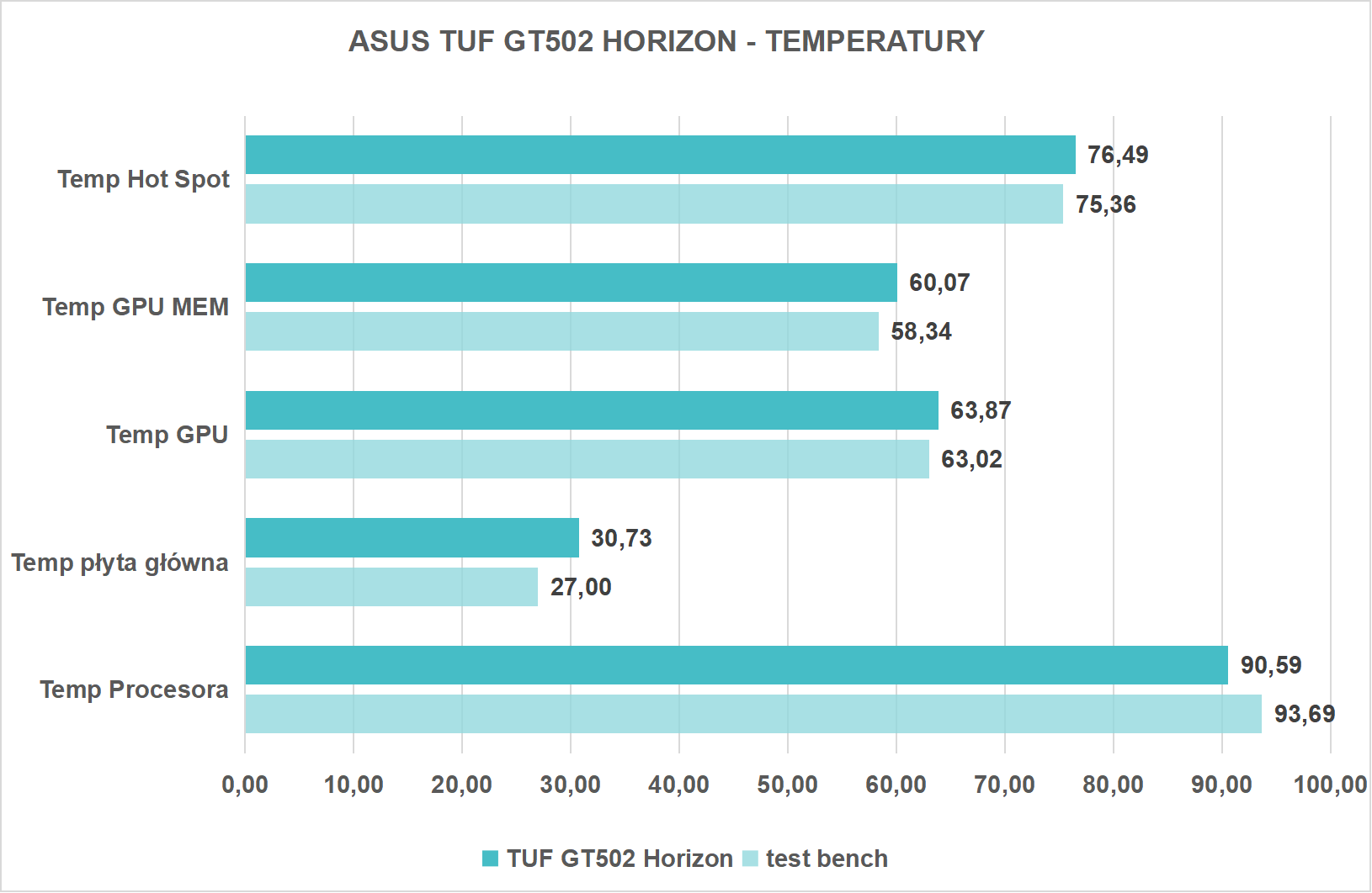 Sprawdziłem zarówno maksymalną temperaturę osiąganą przez procesor, jak i przez kartę graficzną czy płytę główna przy pełnym obciążeniu. Otrzymane rezultaty porównałem z wynikami osiągniętymi podczas testów na otwartej platformie testowej, z której korzystam na co dzień.