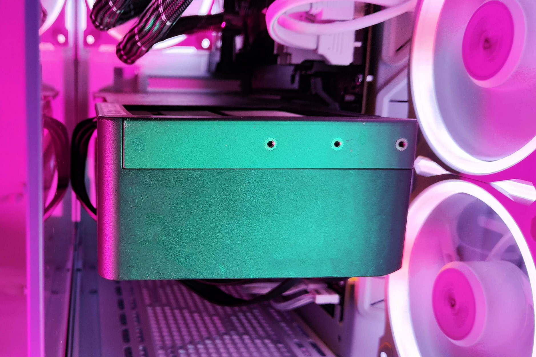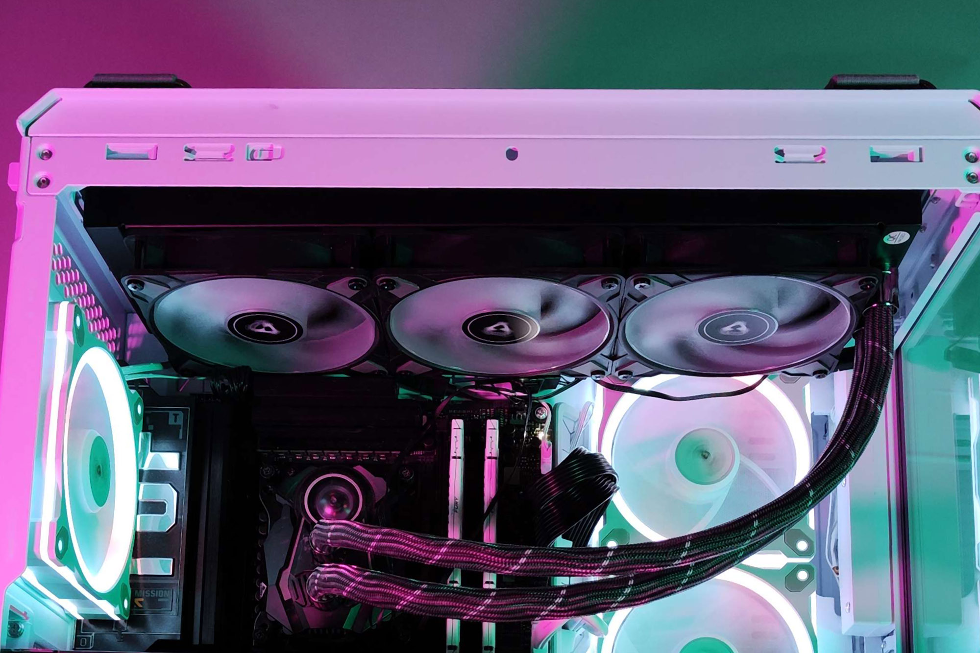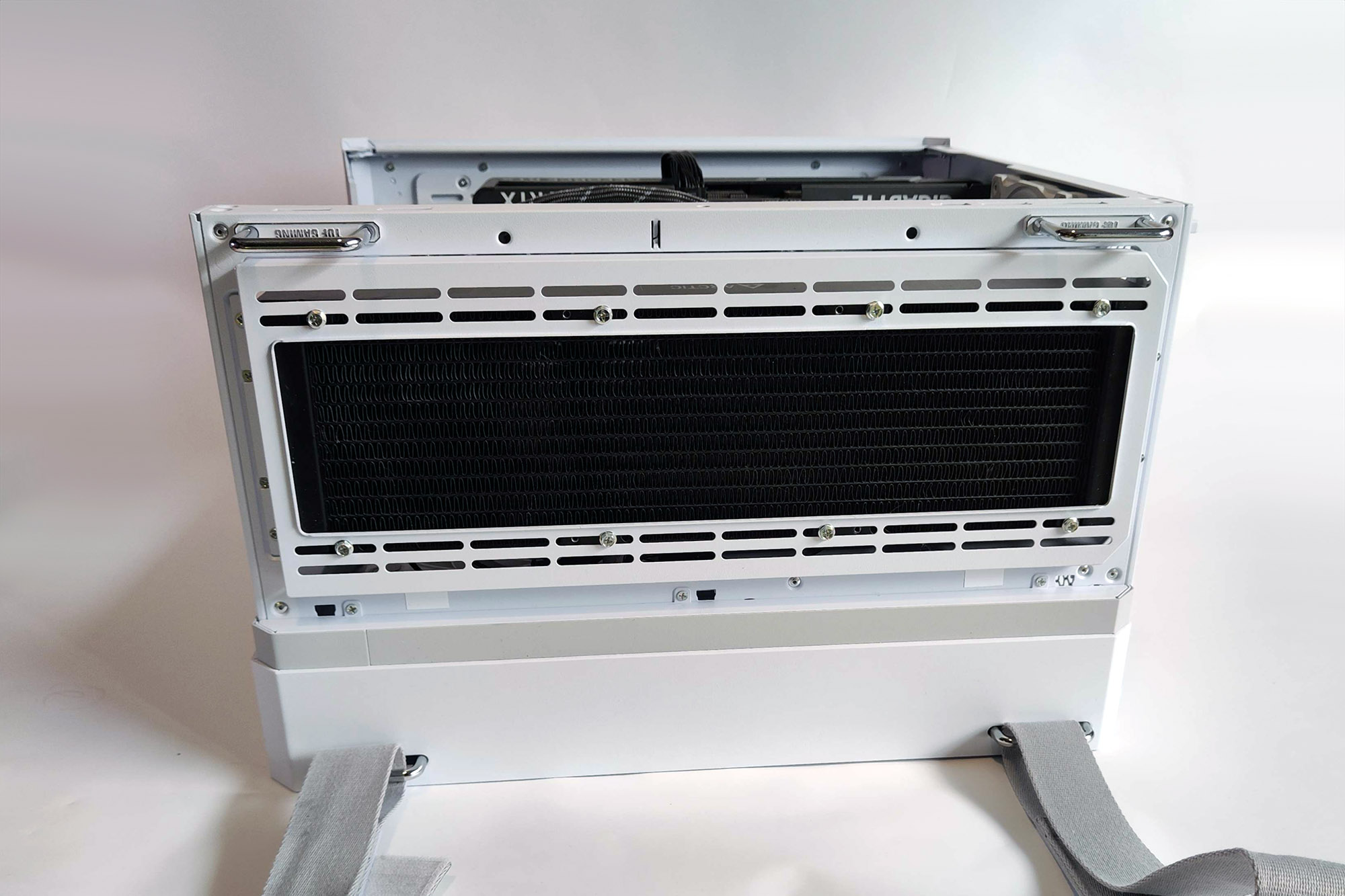 Wróćmy jednak na chwile do samych ramek montażowych chłodnic. Te niestety nie obsługują tak zwanego offsetu, więc tak naprawdę istnieje możliwość instalacji 360 milimetrowej chłodnicy tylko w jednym położeniu. W przypadku użytego podczas testów chłodzenia – Arctic Liquid Freezer II 360 ARGB nie stanowiło to problemu. Przypominam jednak, że ta jednostka AIO posiada chłodnice o grubości 37 mm. Niestety, w przypadku tak zwanych custom loopów, możemy natrafić na problemy z kompatybilnością. Grubsze chłodnice 45- czy nawet 60- mm mogą haczyć o rozbudowane radiatory sekcji zasilania płyty głównej, czy nawet pamięci RAM, wiec miejcie to na uwadze. Warto wspomnieć też, że na górze obudowy bez problemu zainstalujemy systemy chłodzenia cieczą w formatach 120, 140, 240, 280 i 360 mm.
