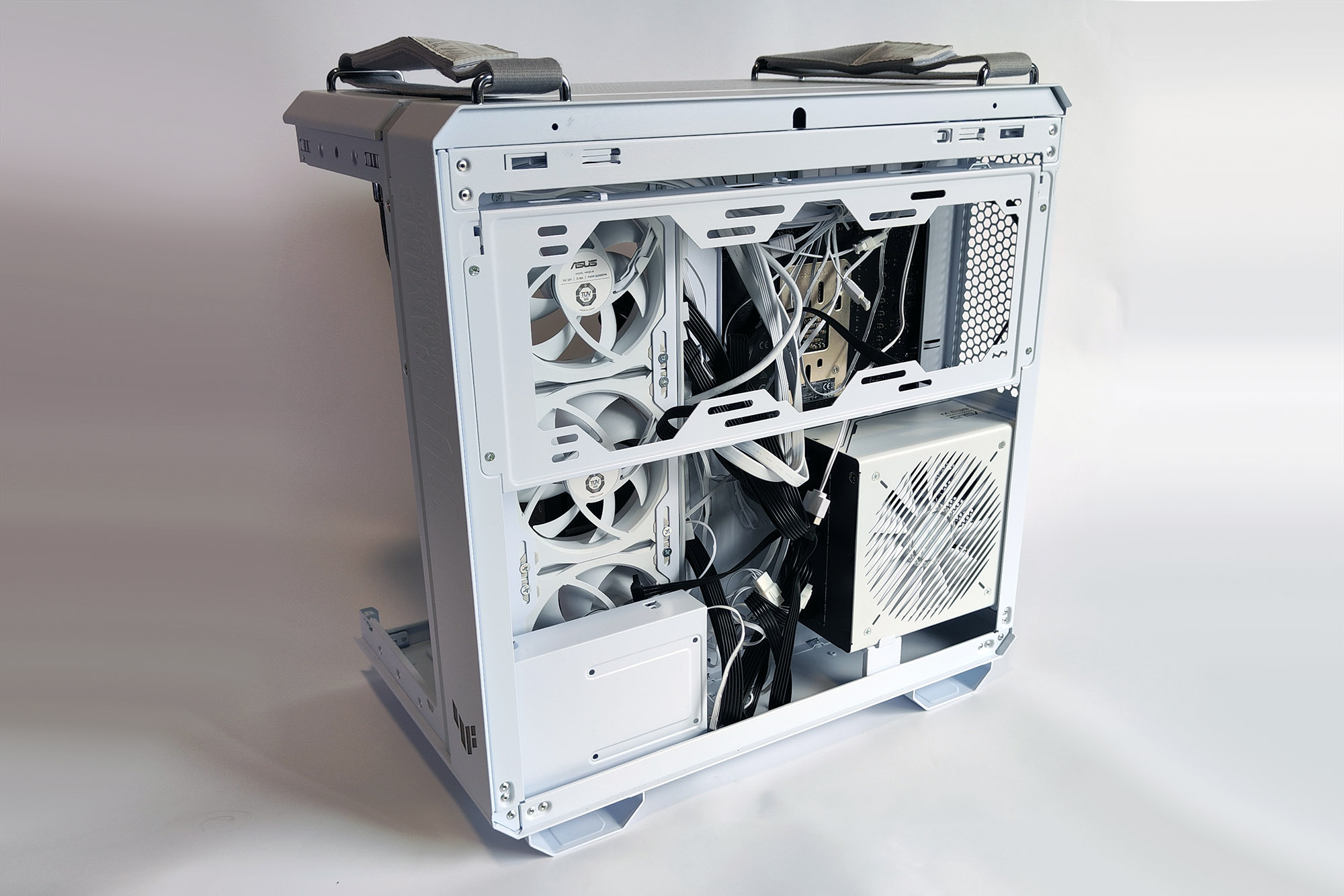 Na górze obudowy na pewno uwagę przyciągają eleganckie i wygodne uchwyty wykonane z materiałowego paska z umieszczonym logo TUF. Są one mocowane do obudowy za pomocą metalowych wsporników i są w stanie utrzymać nie tylko pusty korpus o wadze 11 kg, ale także znajdujące się w nim elementy. Uchwyty mocowane są za pomocą rzepu. Można je łatwo wyjąć i odłożyć. Kilkukrotnie zdarzyło mi się za ich pomocą przenosić cały złożonym komputer, który pewnie ważył już bardziej w okolicach 25 kg, i nie było widać by te miały w żaden sposób puścić.