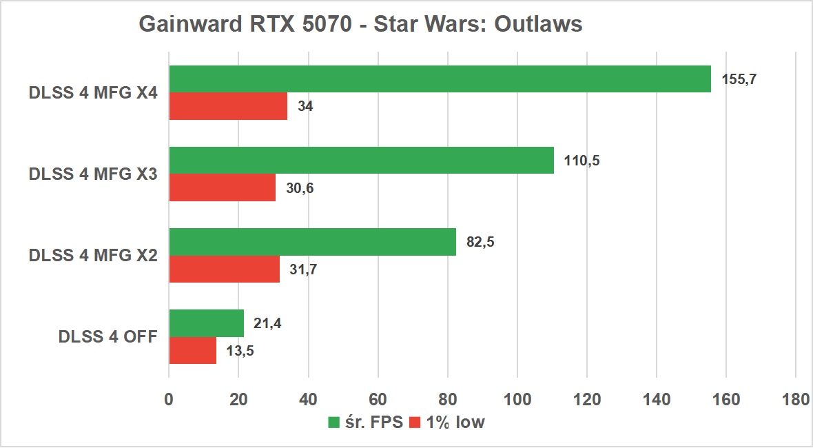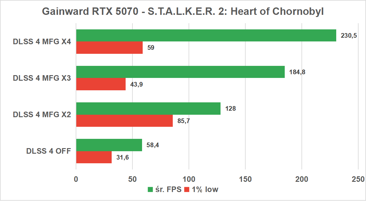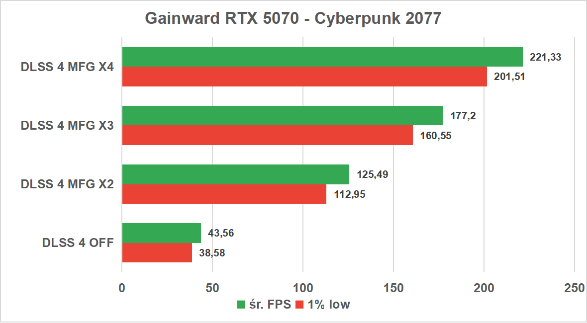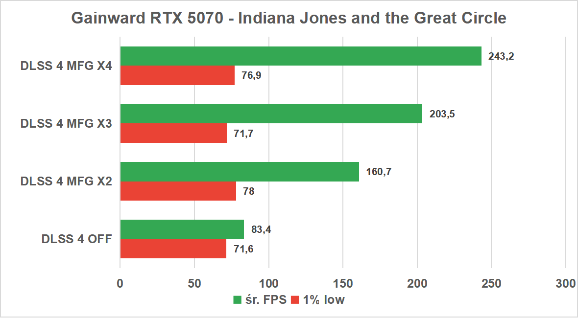 Już na starcie czeka nas miła niespodzianka. Nawet bez wsparcia ze strony AI, Gainward RTX 5070 radzi sobie z tym tytułem znakomicie, oferując średnio ponad 83 klatki na sekundę, a co najważniejsze, z bardzo wysokim progiem 1% low na poziomie 71 FPS. Oznacza to, że już w natywnej rozdzielczości 1440p otrzymujemy w pełni komfortową i stabilną rozgrywkę, nawet przy włączonym śledzeniu promieni.