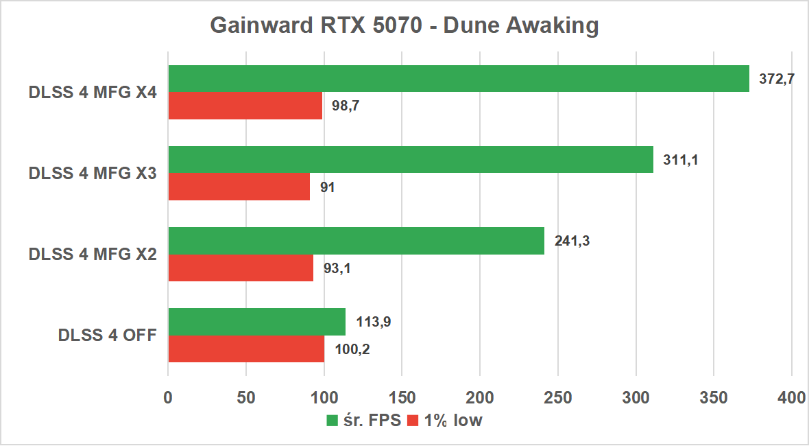 Wyniki bazowe są imponujące. Gainward RTX 5070 w natywnej rozdzielczości 1440p zapewnia średnio ponad 113 klatek na sekundę, a 1% low przekraczający 100 FPS gwarantuje, że nawet bez wspomagania AI rozgrywka jest idealnie płynna. To doskonały punkt wyjścia, który świadczy o świetnej optymalizacji gry.