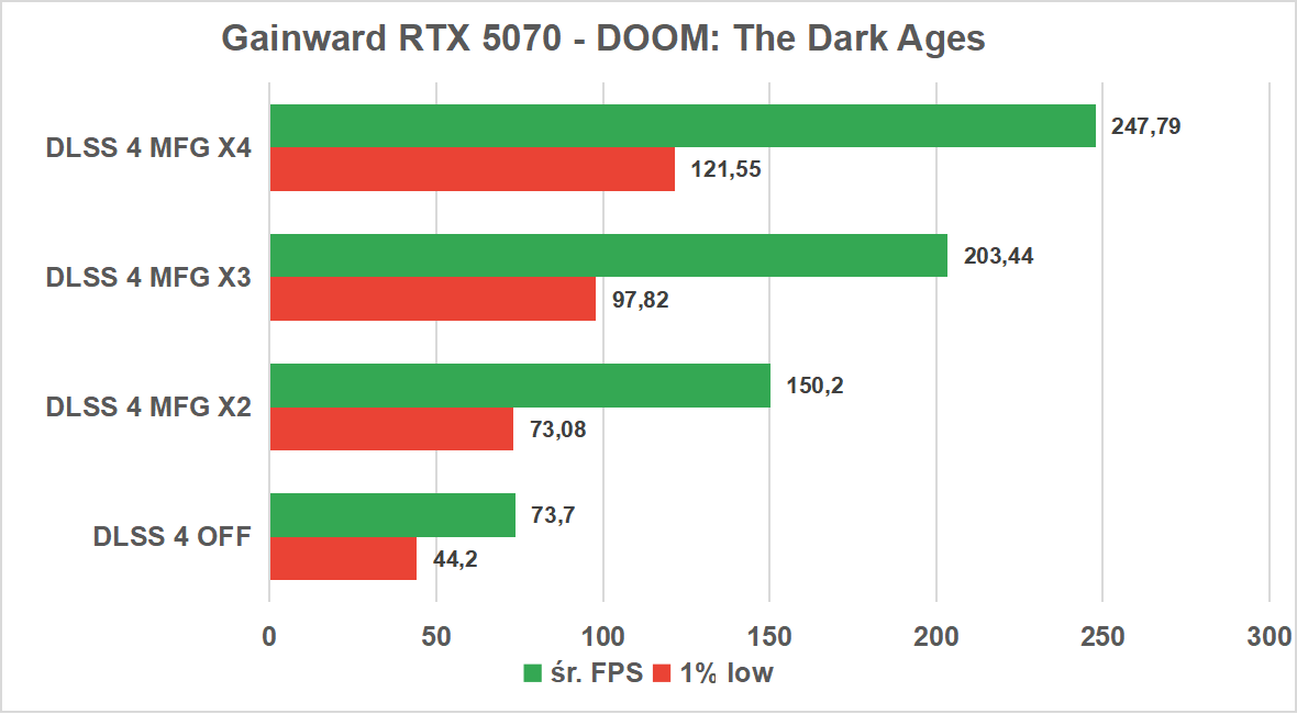 Dla fanów DOOM-a prawdziwa zabawa zaczyna się jednak przy wyższych profilach Multi Frame Generation. Tryb „x3” przebija barierę 200 FPS, utrzymując 1% low blisko 100 FPS, a „x4” to już czyste szaleństwo, niemal 250 FPS przy minimalnych spadkach powyżej 120 FPS. To oznacza, że nawet w najbrutalniejszych starciach animacja pozostaje idealnie płynna, a gracz zyskuje przewagę, która w świecie DOOM-a dosłownie decyduje o przetrwaniu.
