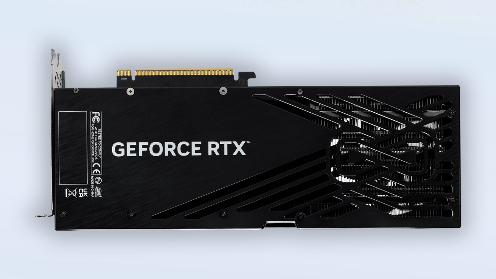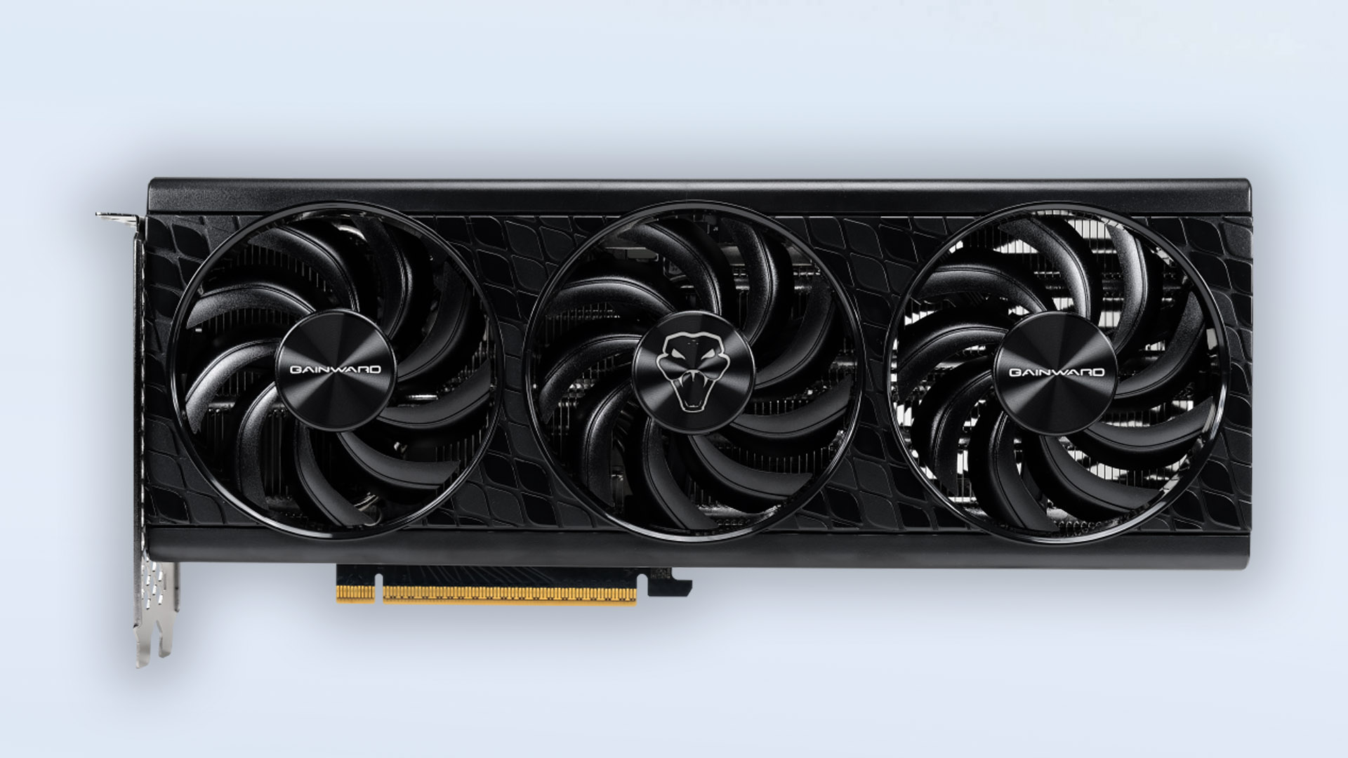 Z przodu uwagę od razu przyciąga chłodzenie z trzema dużymi wentylatorami, które wypełniają całą konstrukcję. To klasyczne, sprawdzone rozwiązanie, które gwarantuje dobre temperatury przy zachowaniu rozsądnej głośności. Brak RGB może część graczy zaskoczyć, ale dla wielu będzie to zaleta – całość utrzymana jest w stonowanej, czarnej stylistyce, a jedynym akcentem wizualnym jest charakterystyczne logo Pythona na środkowym wentylatorze.