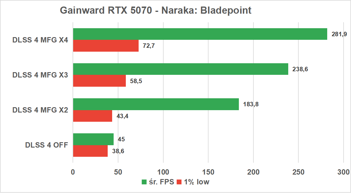 Rozgrywka w natywnej rozdzielczości 1440p na najwyższych ustawieniach jest sporym wyzwaniem dla karty Gainward RTX 5070, która generuje średnio 45 klatek na sekundę. To wynik, który nie pozwala na komfortową i, co ważniejsze, konkurencyjną grę. Tutaj technologia DLSS 4 pokazuje swoją prawdziwą moc. Już standardowy tryb „x2” czterokrotnie zwiększa wydajność, windując średnią liczbę klatek do ponad 180, choć 1% low pozostaje na granicy płynności. Prawdziwą zmianę przynoszą jednak zaawansowane profile: tryb „x3” oferuje blisko 240 FPS ze stabilnym 1% low na poziomie 58 klatek, a „x4” pozwala osiągnąć ponad 280 FPS przy 1% low przekraczającym 72 klatki.
