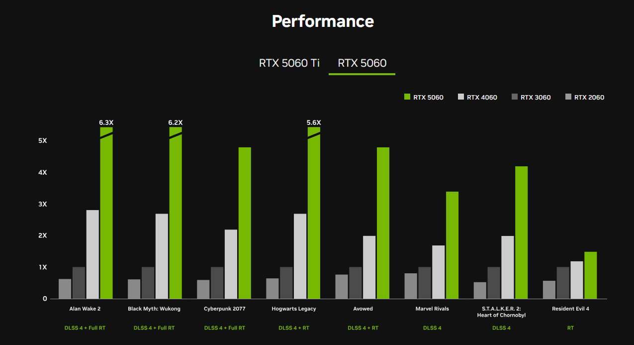 Zmiany, które zaszły zatem w specyfikacji RTX 5060 w stosunku do jego poprzednika, moglibyśmy nazwać ponownie kosmetycznymi. Na pewno nie są tak imponujące, jak w przypadku RTX 5090. Mimo wszystko nowy GeForce powinien być szybszy od RTX 4060. O ile? Biorąc pod uwagę wzrost ilości jednostek obliczeniowych, szybszą pamięć czy wyższe TDP (145 W vs 120 W), różnica może sięgnąć nawet ponad 20%, co byłoby największą procentową wartością w całej rodzinie Blackwell. Oczywiście w materiałach marketingowych zieloni skupiają się wyłącznie na wydajności uzyskanej po włączeniu DLSS4 z MFG. Pozostawmy to może bez komentarza.