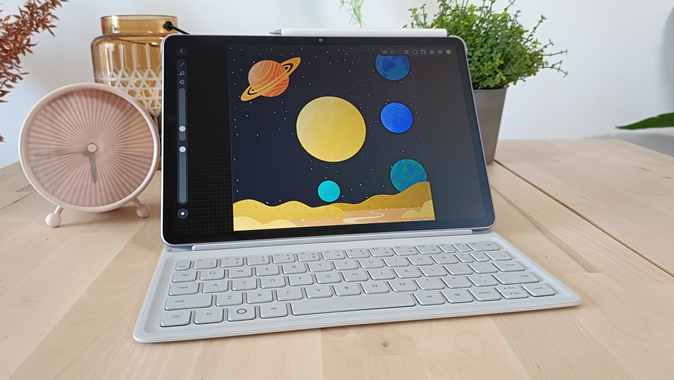 Ale MatePad to nie tylko notowanie. To też tworzenie. Tablet wyposażono w darmową, preinstalowaną aplikację GoPaint. I tu muszę was zaskoczyć: to nie jest żadna „podstawowa” wersja, czy trial. Jak jeszcze nie mieliście z nią do czynienia, to żałujcie, bo to prawdziwy kombajn, idealny dla profesjonalistów, artystów, jak i amatorów. Aplikacja oferuje ponad 100 pędzli i setki warstw, a do tego potrafi symulować różne techniki malarskie, od akwareli po farby olejne. Podsumowując, w zestawie z tabletem otrzymujesz nie tylko klawiaturę i rysik, ale naprawdę dobre oprogramowanie, które w innych przypadkach byłoby dostępne jedynie w dodatkowo płatnej wersji.