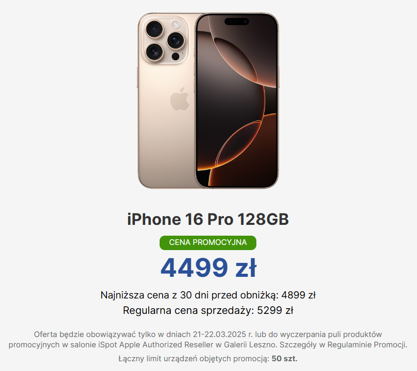 • iPhone 16 Pro 128GB w rewelacyjnej cenie 4499 zł (zamiast 5299 zł) – oferta limitowana do 50 sztuk.