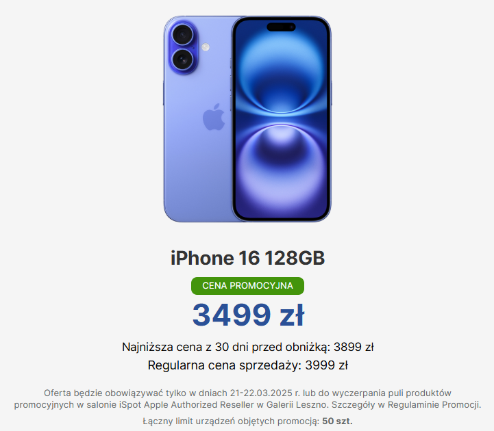 • iPhone 16 128GB już za 3499 zł (zamiast 3999 zł) – również tylko 50 sztuk.