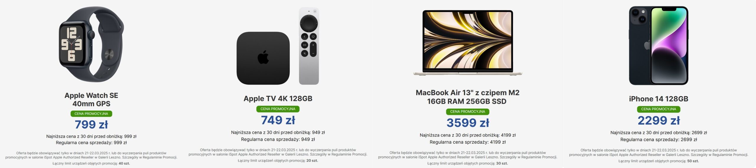 • W promocji pojawią się także modele iPhone’a 14 i 13, a także wiele innych urządzeń, takich jak MacBook Air 13” z czipem M2, Apple TV 4K, AirPods Pro (2. generacji), a nawet Apple Watch Series 10 oraz iPad Air M2/M3.