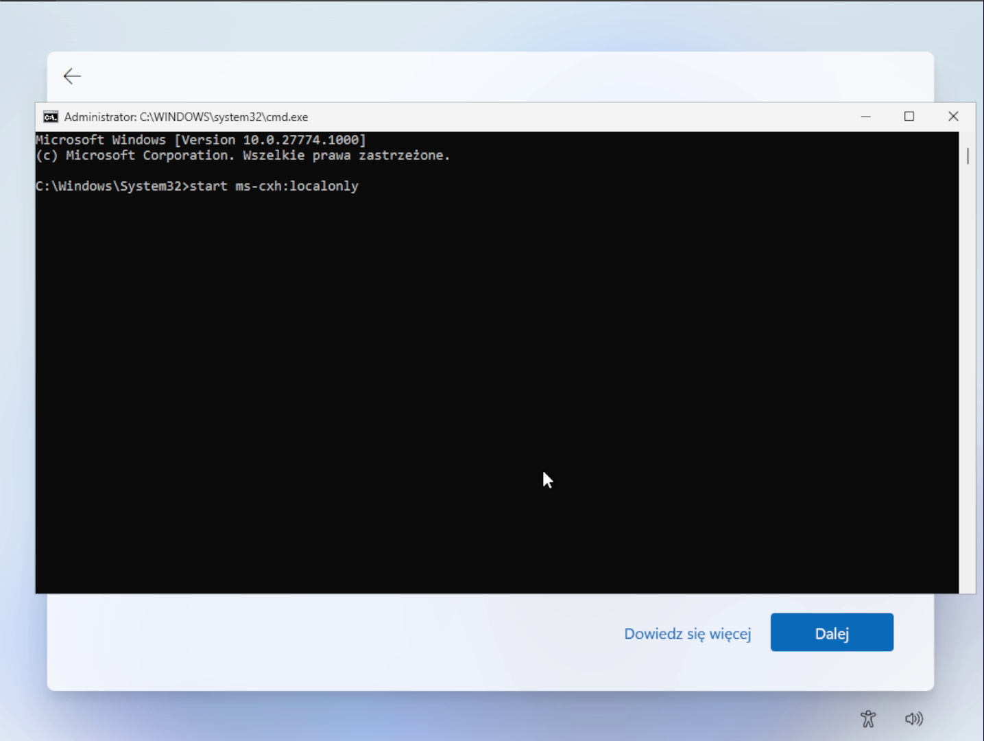 Po zablokowaniu komendy BypassNRO użytkownicy Windows 11 nie zostali jednak całkowicie bezbronni. Społeczność szybko odkryła nową metodę, ukrytą nieco głębiej, ale nadal funkcjonalną – przynajmniej w obecnych wersjach systemu. W trakcie pierwszej konfiguracji systemu wystarczy nacisnąć Shift + F10, co uruchamia wiersz poleceń. Następnie należy wpisać polecenie start ms-cxh:localonly i zatwierdzić klawiszem Enter.