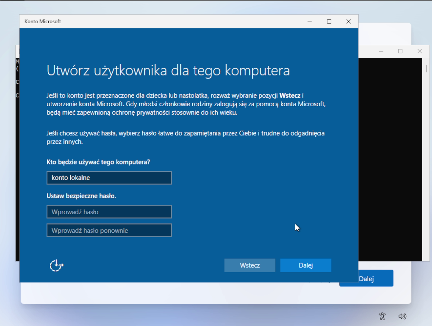 To wywołuje wewnętrzne okno konfiguratora kont, które z niewiadomych powodów nie zostało jeszcze zablokowane przez Microsoft. W praktyce wygląda ono bardzo podobnie do klasycznego kreatora znanego z Windows 7 i XP – żadnych wymuszonych loginów, żadnego internetu. Co ciekawe, cała procedura nie wymaga aktywnego połączenia z siecią, co samo w sobie świadczy o tym, że funkcjonalność ta była (i być może nadal jest) celowo zaimplementowana jako awaryjny tryb.