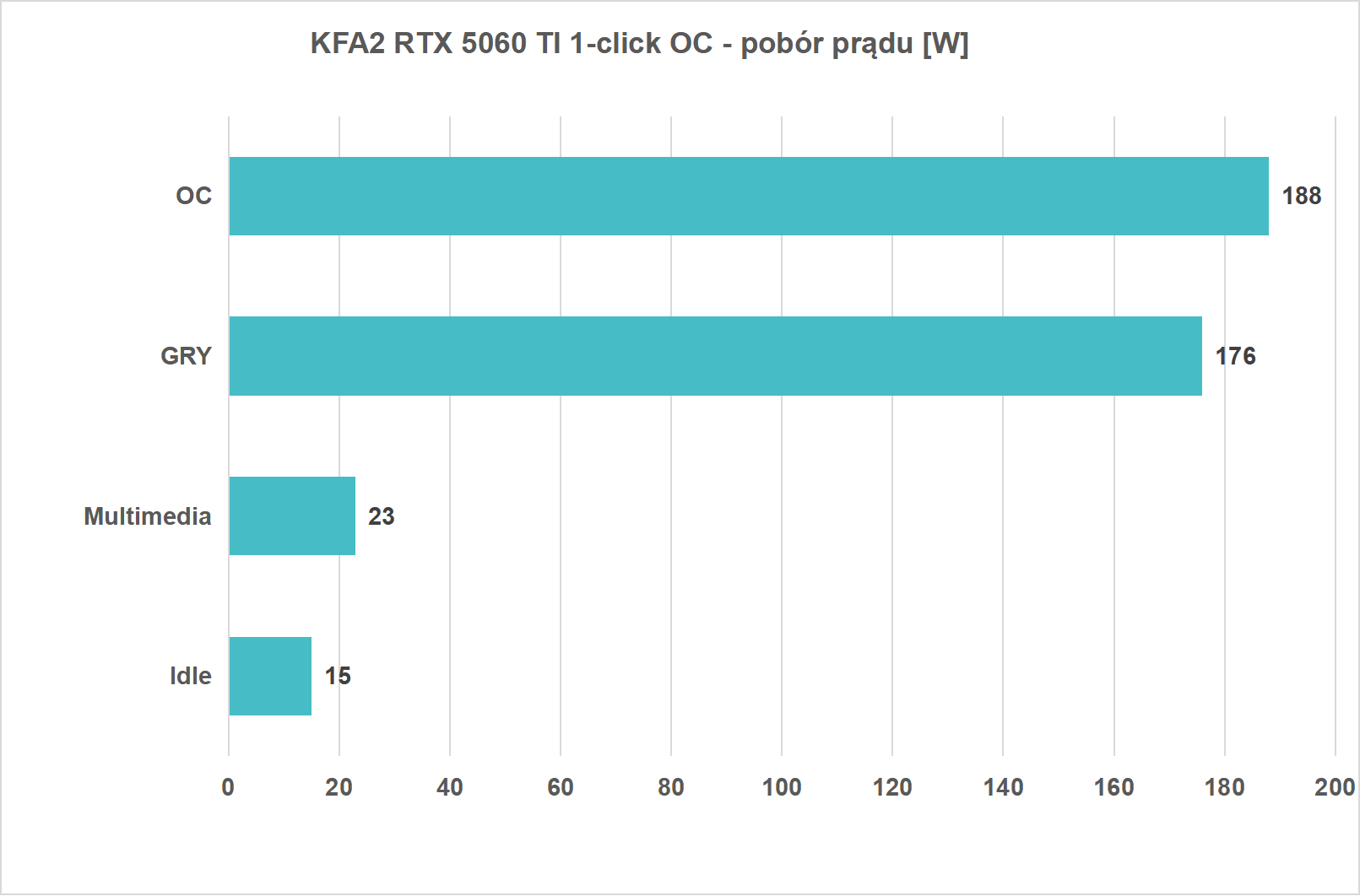 Interesująco wygląda również kwestia pobór prądu przez RTX 5060 Ti. Konstrukcja KFA2 posiada domyślnie ustawiony limit mocy zgodny ze specyfikacją NVIDII. By sprawdzić realny pobór energii, posłużyłem się przyrządem PMD-USB wyprodukowanym przez ElmorLabs, wykorzystywanego już we wcześniejszych recenzjach. Ten został uzupełniony o odpowiedni adapter na złącze PCIe, dzięki czemu możemy dokonywać pomiaru całościowego. Z racji na zastosowania tylko jednej wtyczki zasilania 8-pin PCIe, nie ma szans by cała moc potrzebna do zasilania rdzenia RTX 5060 TI pochodziła z jednego źródła. Przypominam, że według specyfikacji pojedyncze 8 pinowe gniazdo może dostarczać “tylko” 150 Watów. Pozostała moc musi zatem pochodzić ze złącza PCIe na naszej płycie głównej. Tak przynajmniej mówi teoria. Tutaj warto jednak zaznaczyć, że producent nie przekracza “bezpiecznych norm”. Nawet po podkręceniu złącze na naszej płycie głównej nie dostarcza więcej niż “zaledwie” 50 Watów energii.