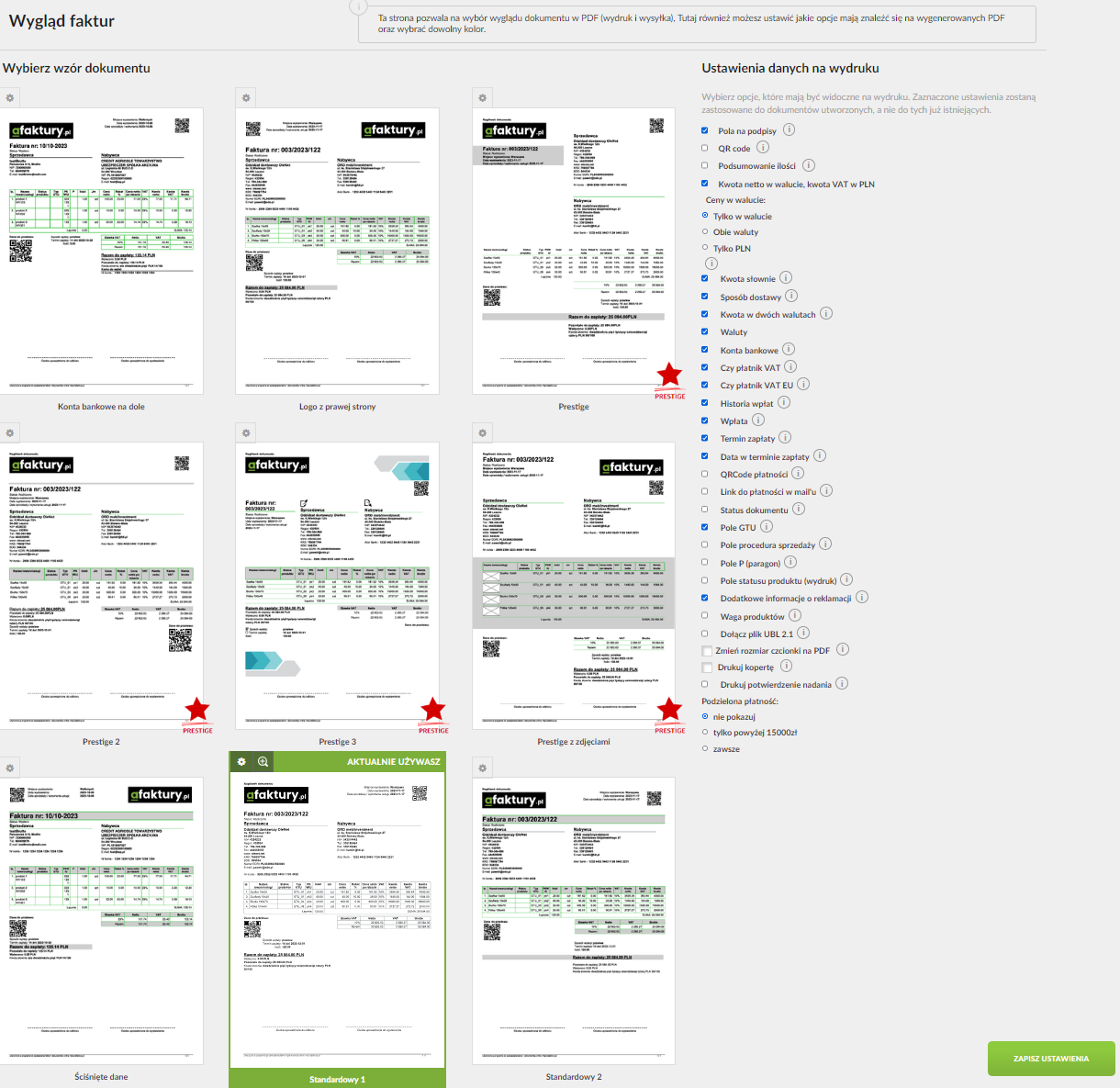 Do naszej dyspozycji oddano pokaźną galerię gotowych szablonów. Znajdziemy tu zarówno minimalistyczne wzory standardowe, jak i bardziej rozbudowane. Niektóre oznaczone jako „Prestige”, które dostępne są w wyższych pakietach abonamentowych. Co jednak ważniejsze, mamy ogromną kontrolę nad tym, jakie informacje znajdą się na finalnym wydruku. W panelu ustawień możemy decydować o niemal każdym elemencie. Możemy włączyć lub wyłączyć wyświetlanie na wydruku takich detali jak kod QR do płatności, kwota słownie, pole statusu płatności czy nawet kody GTU i wiele więcej.