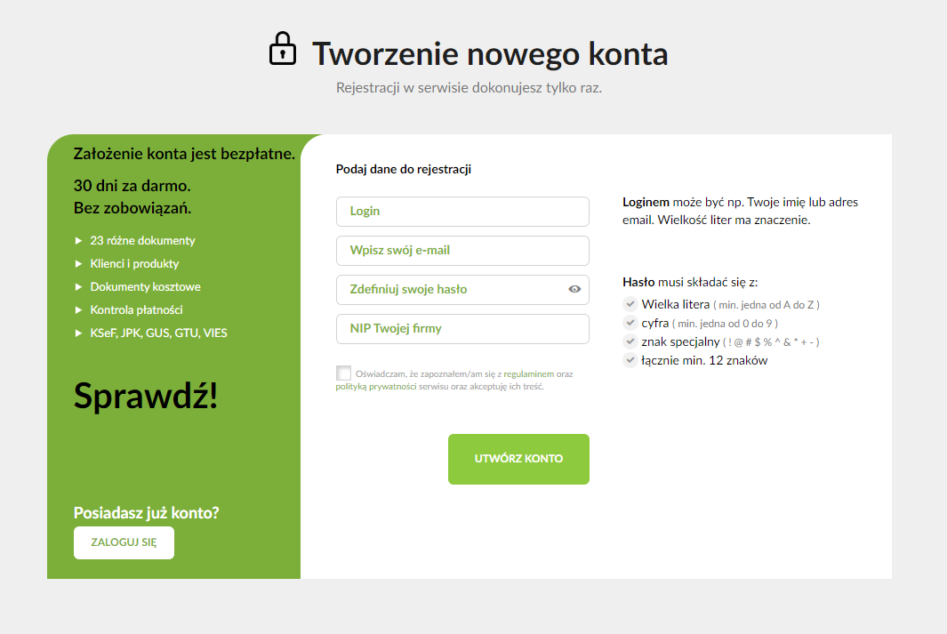 Każda przygoda z nowym oprogramowaniem zaczyna się od procesu rejestracji, który często jest pierwszą wizytówką usługi. W przypadku aFaktury.pl ten pierwszy kontakt jest bardzo pozytywny. Formularz jest prosty i wymaga podania tylko niezbędnych danych: loginu, adresu e-mail, hasła oraz numeru NIP firmy. Już na tym etapie serwis jasno komunikuje swoją ofertę. Założenie konta jest bezpłatne, a nowy użytkownik otrzymuje 30 dni na darmowe testy bez żadnych zobowiązań. Rejestracja w aFaktury.pl to proces, który nie powinien zająć więcej niż dwie minuty.