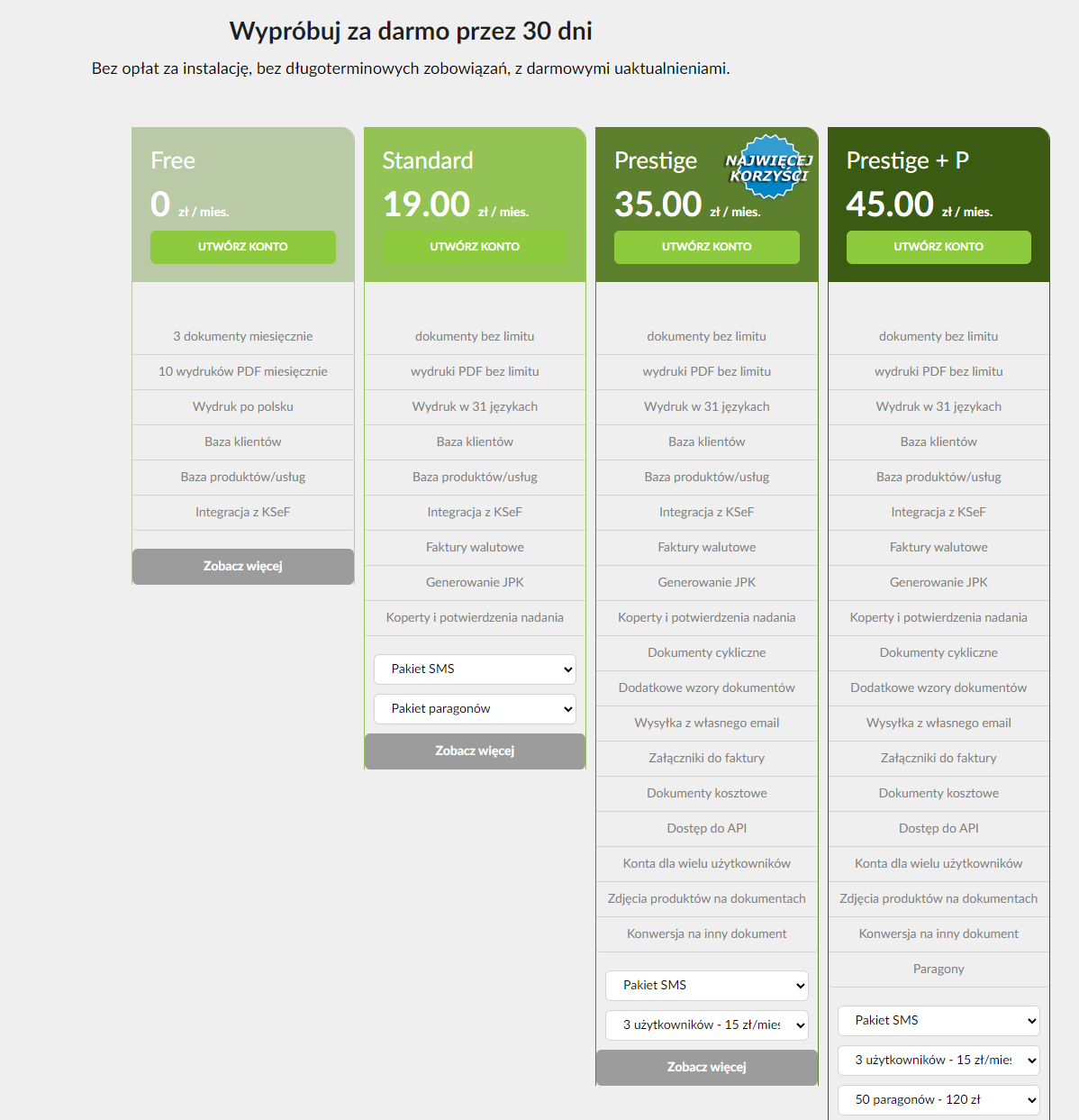 Idąc o krok dalej, pakiet Prestige za 35,00 zł miesięcznie wprowadza narzędzia do automatyzacji, jak dokumenty cykliczne, a także daje dostęp do API i możliwość tworzenia kont dla wielu użytkowników. W ramach pakietów Prestige i wyższych użytkownik może także rejestrować faktury zakupowe, co umożliwia kontrolę kosztów firmy i przygotowanie pełniejszych raportów księgowych. Na szczycie oferty znajduje się plan Prestige + P (45,00 zł miesięcznie), który zawiera pełną funkcjonalność niższych pakietów, rozszerzając ją głównie o możliwość wystawiania paragonów.