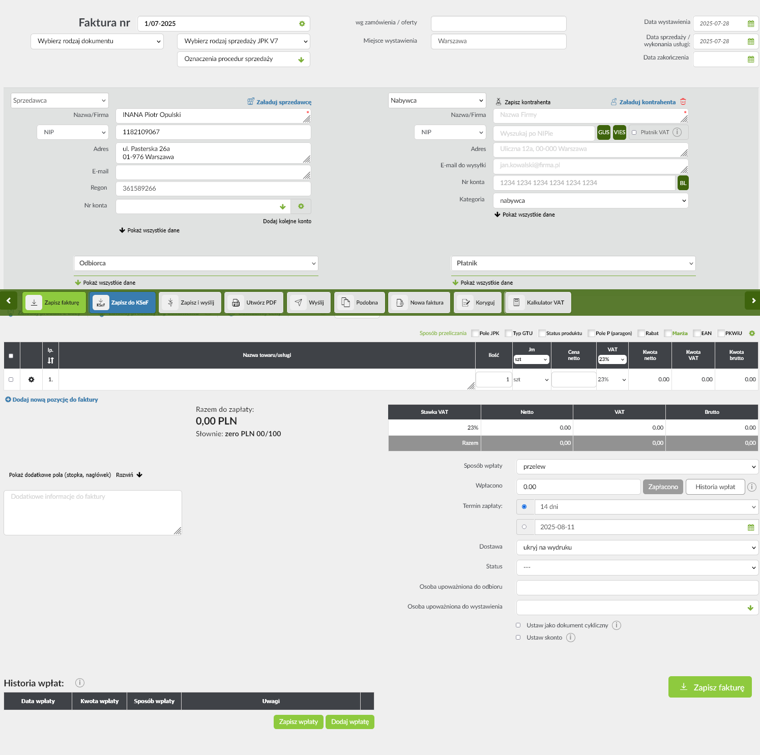 Prawdziwa magia dzieje się jednak po stronie „Nabywcy”. Wystarczy wpisać numer NIP kontrahenta i kliknąć przycisk „GUS” lub „VIES”, by wszystkie jego dane, od nazwy po adres, zostały zaciągnięte automatycznie. To fundamentalna funkcja, która nie tylko drastycznie przyspiesza pracę, ale przede wszystkim minimalizuje ryzyko kosztownych pomyłek. Tabela pozycji na fakturze jest przejrzysta i pozwala na łatwe dodawanie kolejnych towarów lub usług, zdefiniowanie ich ilości, cen i stawek VAT.