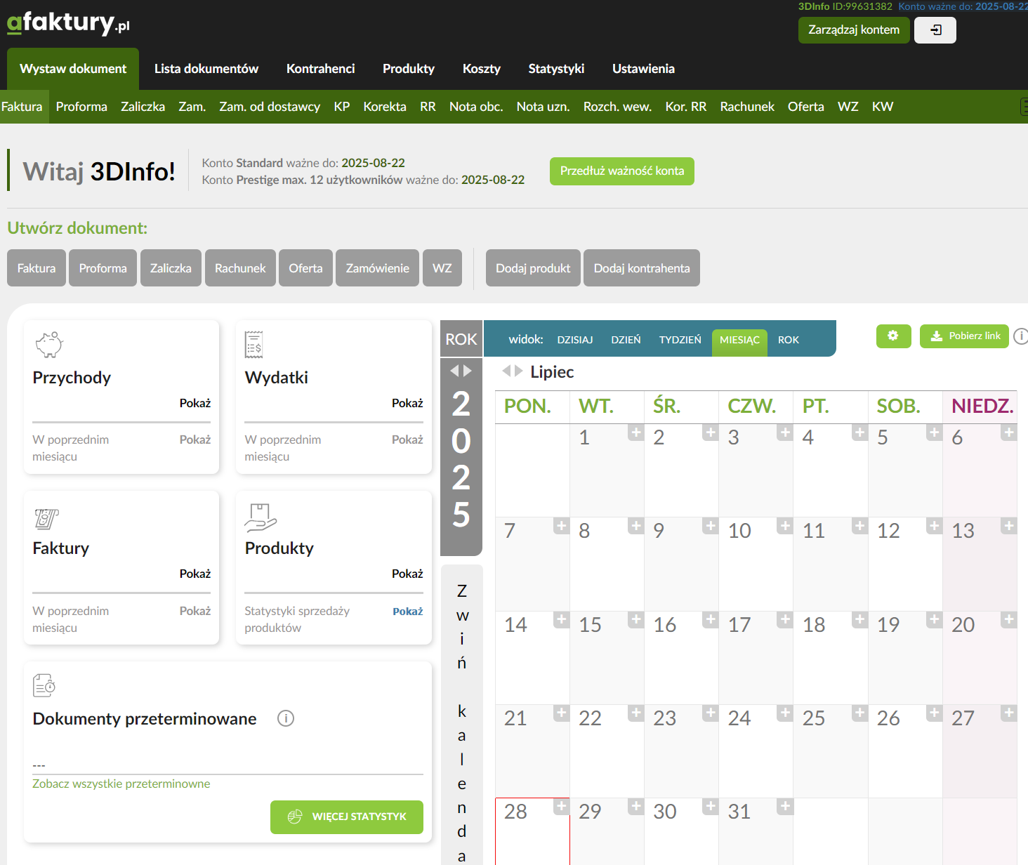 Centralną część panelu zajmuje dashboard z kluczowymi informacjami podanymi w formie zgrabnych “widżetów”. Mamy tu szybki podgląd na przychody i wydatki w bieżącym miesiącu, statystyki produktów oraz, co niezwykle przydatne, listę dokumentów przeterminowanych, która od razu rzuca się w oczy. Miłym dodatkiem jest duży widok kalendarza na dany miesiąc, który pozwala szybko zorientować się w terminach. Pierwsze wrażenie jest bardzo pozytywne. System prowadzi użytkownika za rękę, nie przytłaczając go nadmiarem informacji, a jednocześnie dając poczucie, że wszystkie niezbędne narzędzia są w zasięgu jednego kliknięcia.