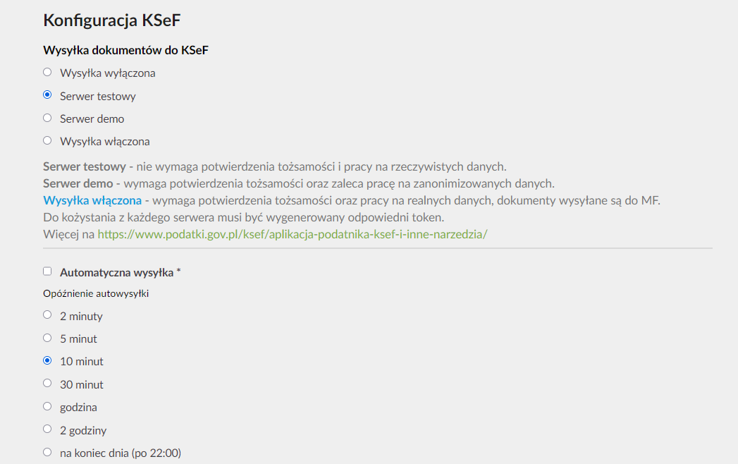 Dodatkowo, dla zwolenników automatyzacji przygotowano opcję „Automatycznej wysyłki”, którą można skonfigurować z opóźnienie. Na przykład 10 minut, godzinę, a nawet na koniec dnia po godzinie 22:00. Daje to cenny bufor bezpieczeństwa na ewentualne poprawki, zanim dokument oficjalnie trafi do systemu Ministerstwa Finansów. Takie opcje konfiguracyjne świadczą o dojrzałości implementacji i realnym zrozumieniu potrzeb przedsiębiorców.