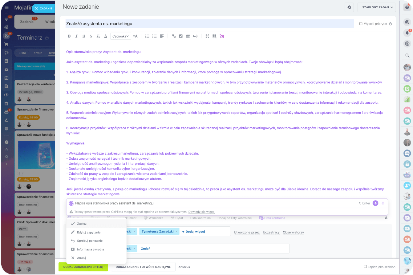 W Bitrix24, CoPilot pomaga uporządkować projekt od pierwszego pomysłu – generuje opis, checklistę i streszczenie komentarzy. Dalsze planowanie, przypomnienia czy harmonogram z łatwością można ustawić bezpośrednio w zadaniach, korzystając z widoków Kanban lub Gantta.