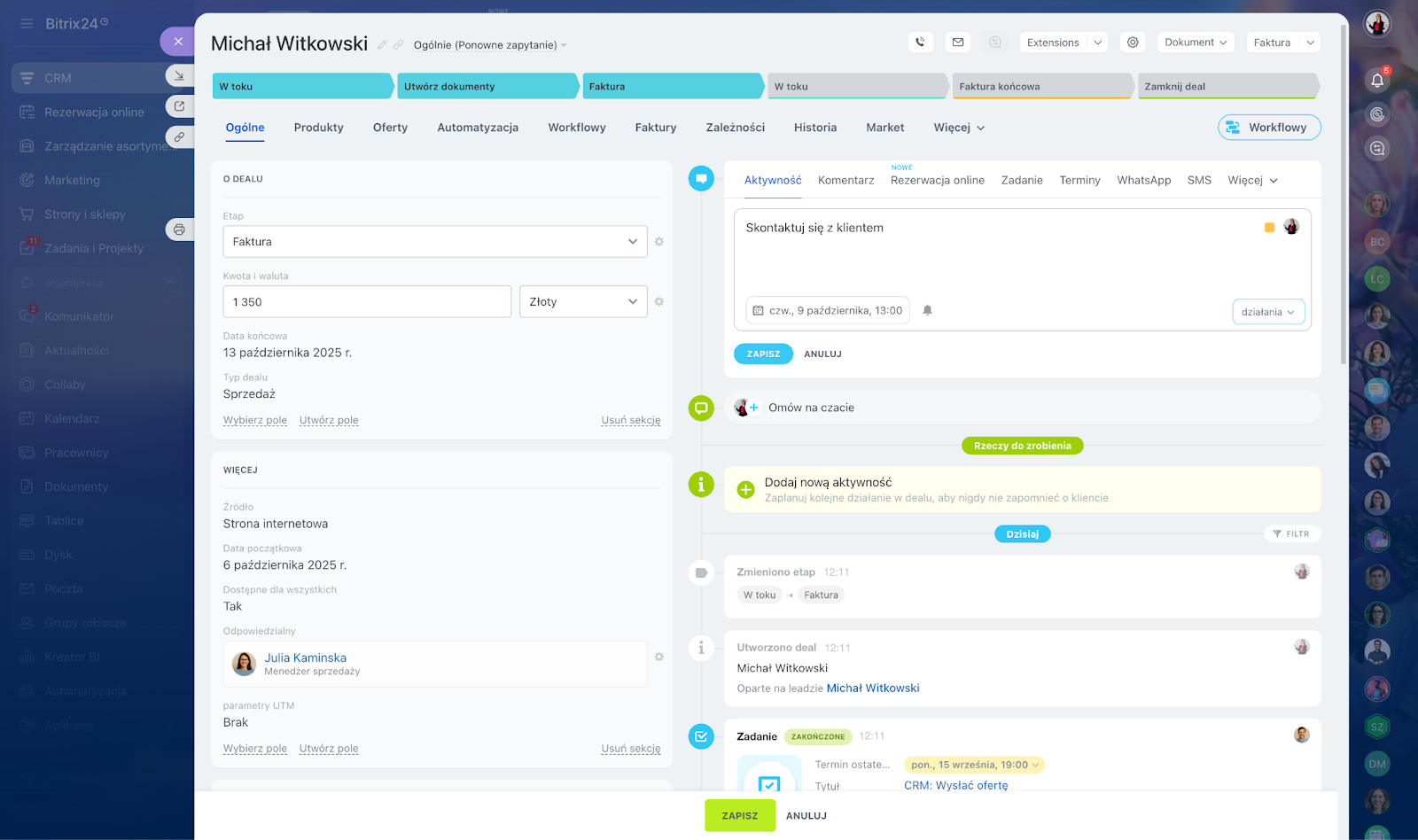 W systemach takich jak Bitrix24 asystent CoPilot AI potrafi transkrybować rozmowy, uzupełniać pola w leadach lub transakcjach, a wysyłki ofert i zadań follow-up można ustawić za pomocą reguł automatyzacji w CRM. Dzięki temu zespół nie gubi wątków i nie musi pamiętać o każdym szczególe.