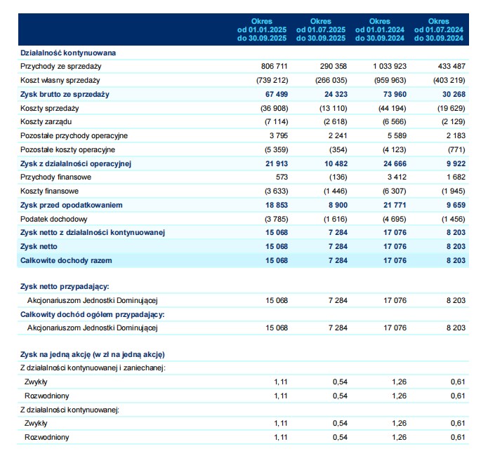 Choć przychody Grupy w pierwszych trzech kwartałach 2025 roku wyniosły 806,7 mln zł, co oznacza korektę o około 22% względem rekordowego roku ubiegłego, zarząd spółki zachowuje spokój. Traktuje to jako naturalne „wyhamowanie po bardzo dynamicznych wzrostach ostatnich lat”. Co najważniejsze dla inwestorów i branży mniejsza skala obrotów nie przeszkodziła w poprawie kluczowych wskaźników efektywności.