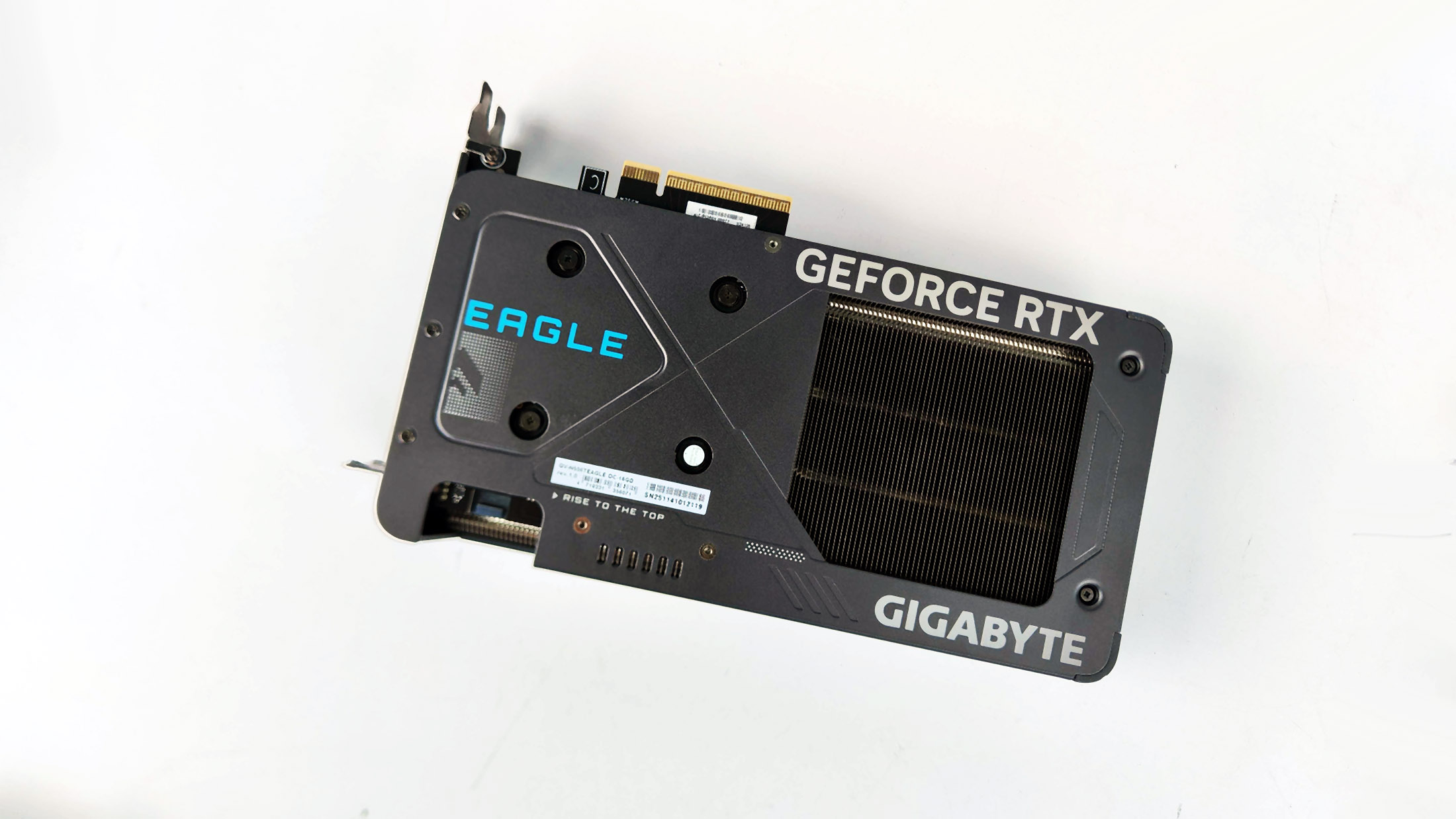 RTX 5060 Ti podobnie jak model poprzedniej generacji korzysta wyłącznie z 8 lini interfejsu PCIe, do komunikacji z naszym komputerem. Oczywiście mówimy o najnowszej i najszybszej wersji, czyli standardzie 5.0. Mimo to przeważnie producenci GPU decydują się na stosowanie pełnowymiarowego slotu. W przypadku modelu Eagle od Gigabyte mamy do czynienia z fizycznie “okrojonym” złączem, które co by nie mówić wygląda dość nienaturalnie. Wydaje mi się, że jestem też w stanie wskazać przyczynę czemu producent, zdecydował się na takie rozwiązanie. Po prostu sama płytka PCB na której bazuje RTX 5060 Ti nie jest na tyle długa by “zmieścił się” w pełni wymiarowy slot.