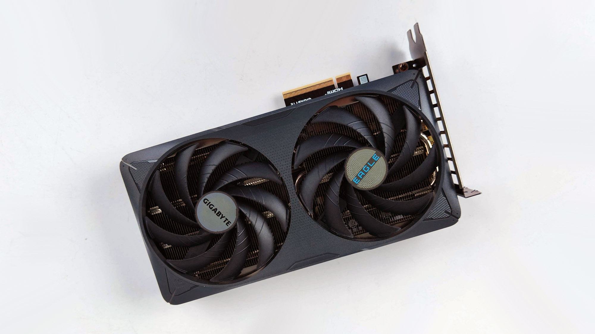 Gigabyte GeForce RTX 5060 Ti Eagle OC 16G to kompaktowa karta graficzna z dość minimalistycznym designem. Jej długość to zaledwie 215 mm, szerokość 122 mm, a grubość 40 mm. Oznacza to, że RTX 5060 Ti od Gigabyte zajmuje tylko dwa sloty w naszej obudowie, przez co doskonale nadaje się do komputerów o mniejszych rozmiarach zwłaszcza SFF.