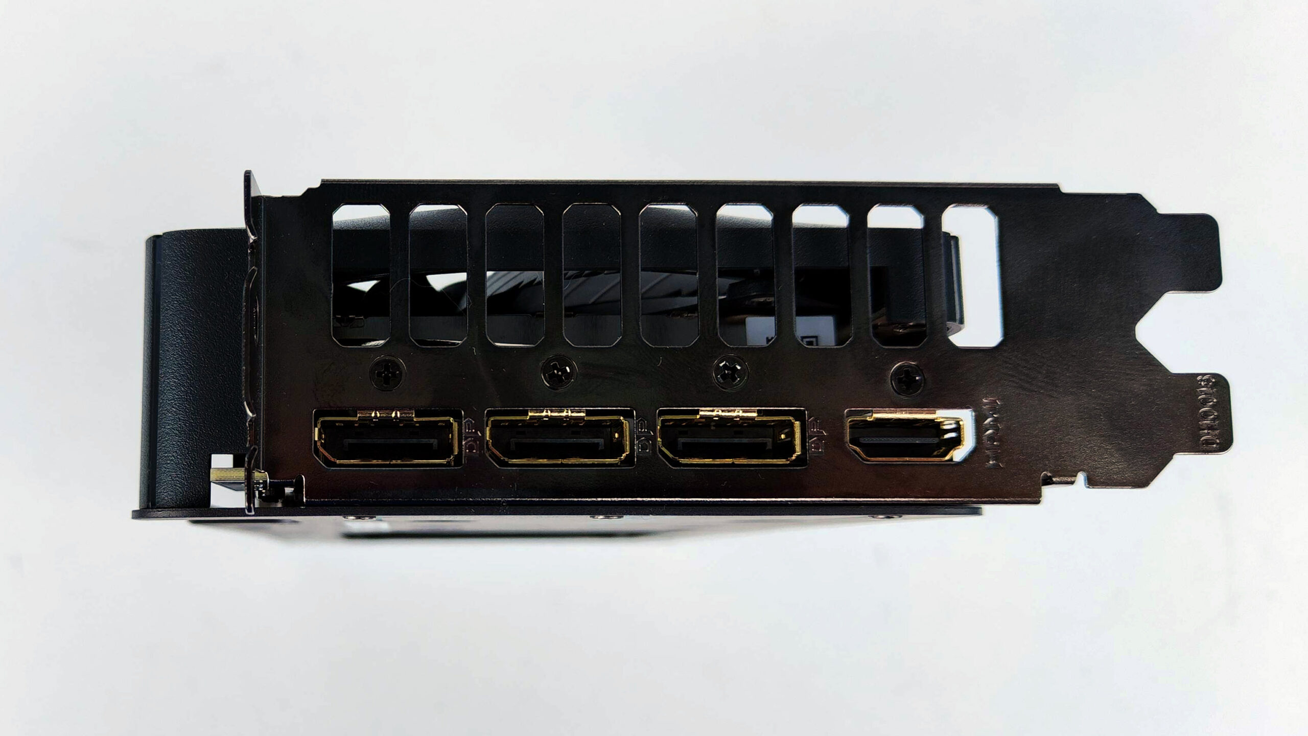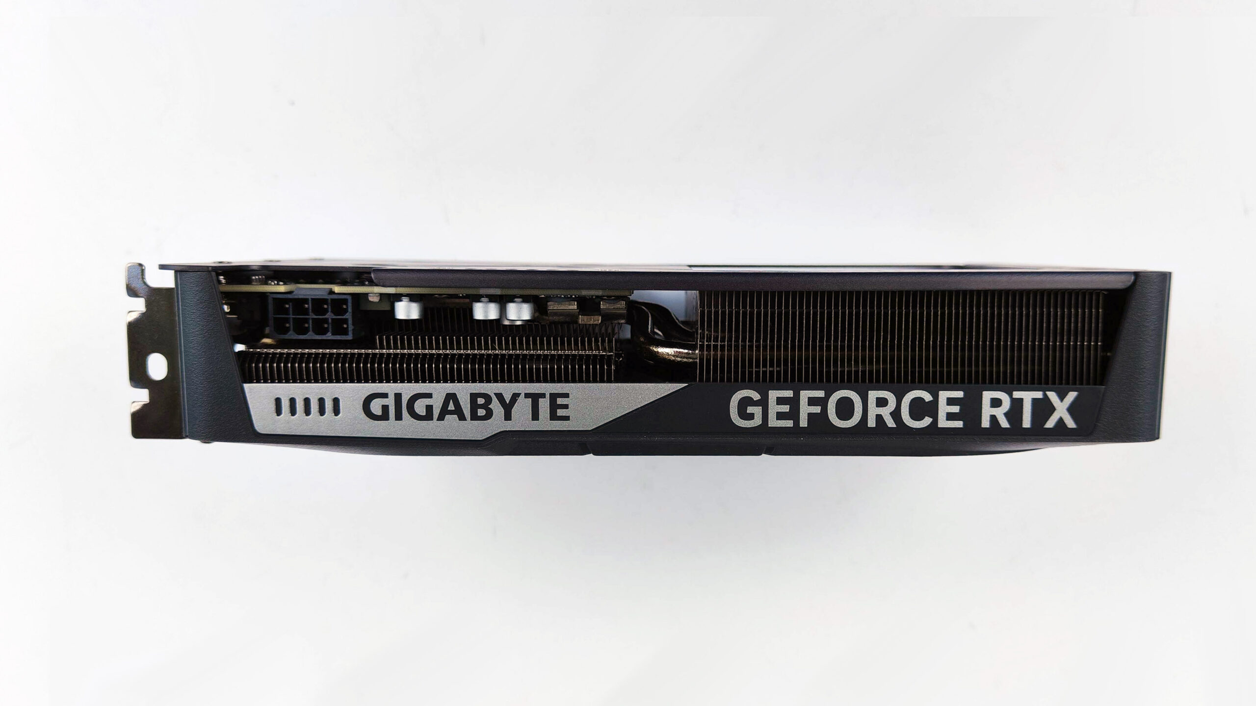 Chłodzenie WINDFORCE zastosowane w tej karcie opiera się na dwóch wentylatorach HAWK o przeciwbieżnym kierunku obrotów, co poprawia przepływ powietrza, efektywność chłodzenia jak i poziom generowanego hałasu . Pod obudową znajduje się miedziana płytka bazowa oraz kompozytowe rurki cieplne, które skutecznie odprowadzają ciepło z GPU. Co warto zaznaczyć, te zostały w końcu poniklowane, wiec nie musimy się przejmować, że z czernieją z czasem. Dodatkowo metalowy backplate z technologią Screen Cooling wspomaga pasywne odprowadzanie ciepła poprzez specjalne wycięcia. Nawet mimo tak niewielkich rozmiarów z tyłu znajdziemy spore wycięcie, które umożliwiają jednemu z wentylatorów swobodny przepływ powietrza. Daje nam to dość jasno do zrozumienia z jak “krótkim” PCB mamy do czynienia, ale wrócę do tego tematu odrobinę później.