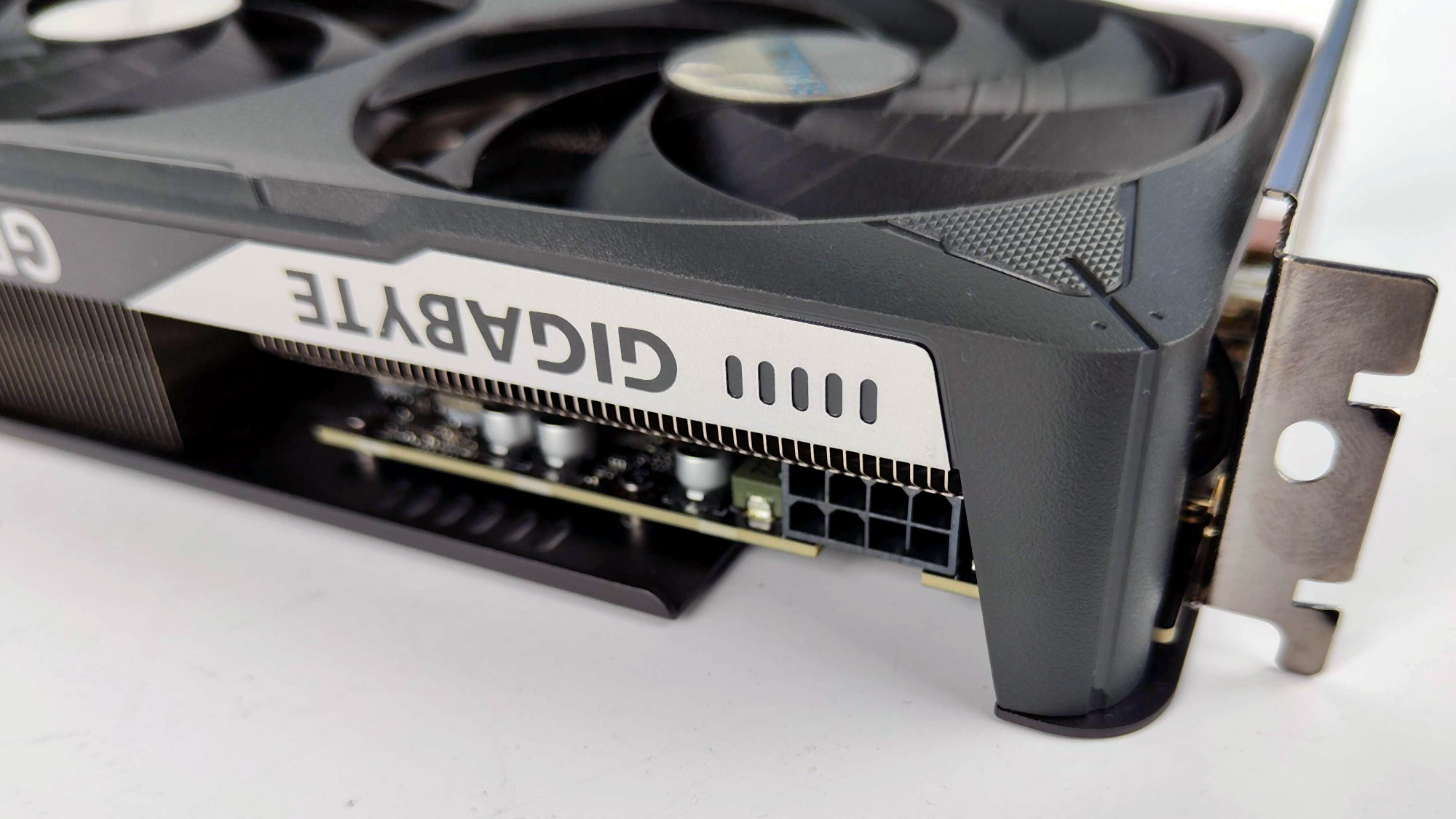 Pod względem zasilania, karta posiada 8-pinowe złącze, a jej TGP wynosi 180 W. I o ile cieszę się, że NVIDIA nie wymusiła na producentach stosowanie wtyczki 12V-2×6, to nie mogę pominąć kwestii umieszczenia gniazda zasilania. Nasuwa się pytanie, czy ktoś to w ogóle przemyślał? Tak dobrze widzicie, złącze zasilania zostało umieszczone niemal na samym froncie karty.
