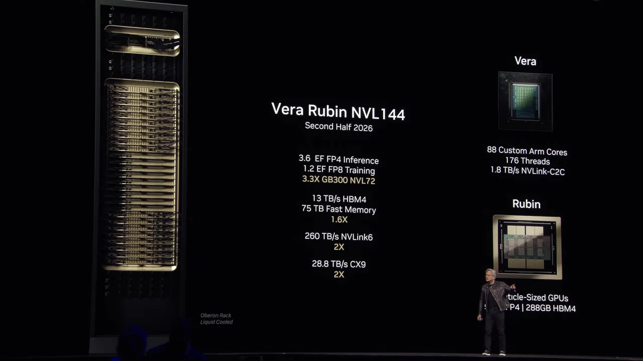 Gotowa szafa serwerowa NVL144, integrująca 144 GPU Rubin i 36 CPU Vera, ma dostarczać zawrotne 3.6 ExaFLOPS mocy w inferencji AI. To poziom superkomputerów narodowych, zamknięty w jednym racku.