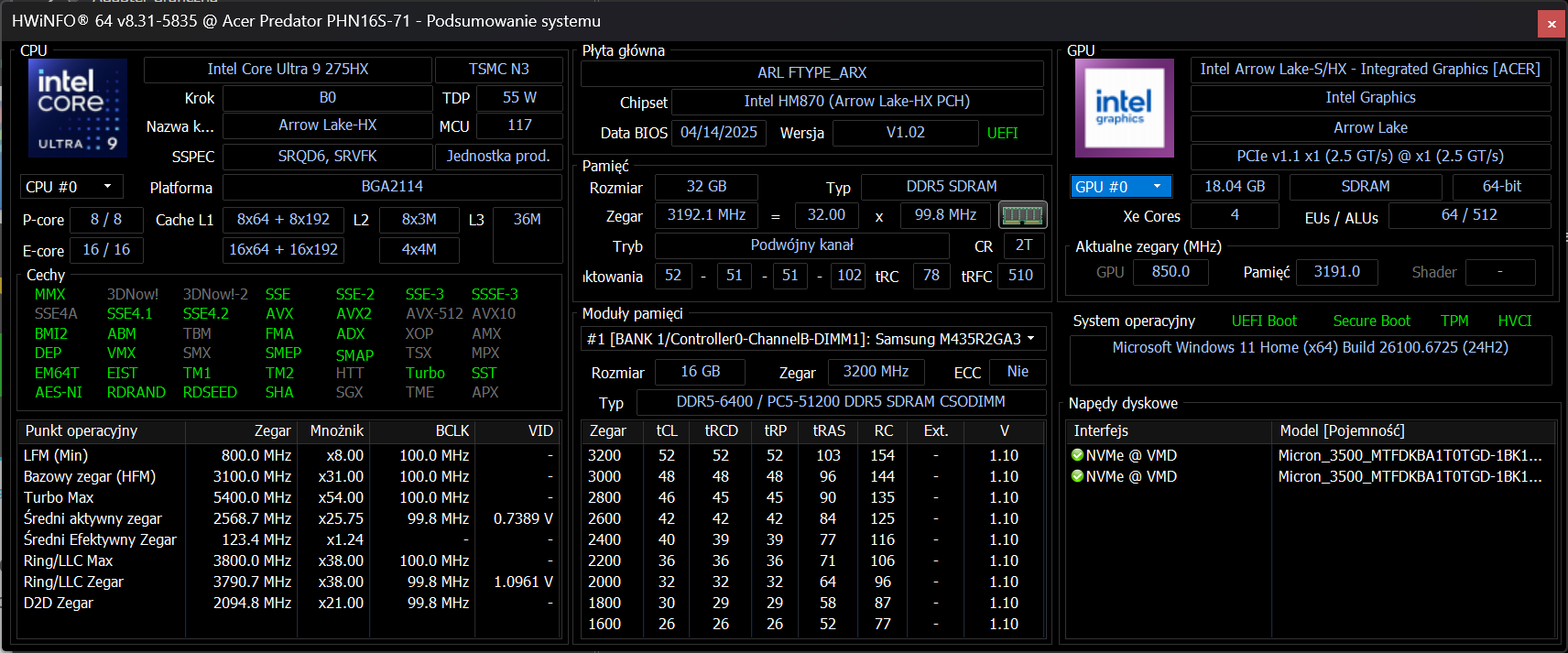 W praktyce efekt jest bardzo dobry. Nawet przy pełnym obciążeniu, czy to w grach, czy podczas renderingu, temperatury pozostają pod kontrolą. Procesor rzadko przekracza 90°C, a karta graficzna utrzymuje się w granicach 80°C.Skoro o podzespołach mowa, przejdźmy do konkretów. Sercem Predatora jest potężny procesor Intel Core Ultra 9 275HX. To prawdziwy gigant w świecie mobilnych CPU, zbudowany w architekturze Arrow Lake-HX i wyposażony w aż 24 rdzenie fizyczne (8 rdzeni Performance i 16 rdzeni Efficient), choć bez obsługi technologii Hyper-Threading. Taka hybrydowa budowa pozwala systemowi dynamicznie żonglować zadaniami, przydzielając te najbardziej wymagające do potężnych rdzeni P, a lżejsze procesy do energooszczędnych rdzeni E. W praktyce przekłada się to na absolutnie topową wydajność w każdym scenariuszu.