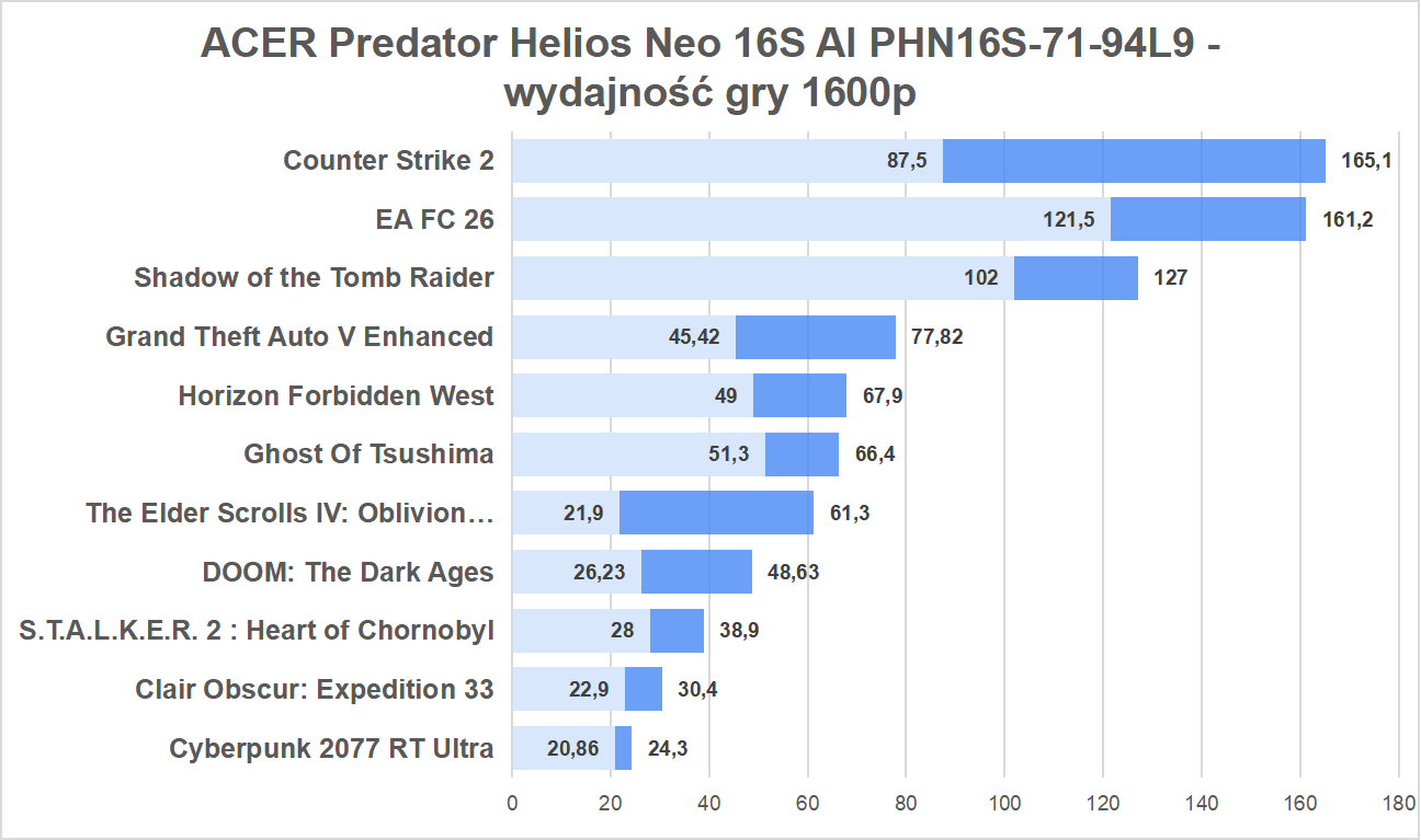 Jak widać, w mniej wymagających, ale wciąż popularnych tytułach, takich jak Counter Strike 2 czy Shadow of the Tomb Raider, laptop z łatwością generuje znacznie powyżej 100 klatek na sekundę, pozwalając w pełni wykorzystać potencjał 240-hercowej matrycy OLED. Schody zaczynają się w najnowszych produkcjach AAA z włączonym Ray Tracingiem. Tytuły takie jak DOOM: The Dark Ages czy S.T.A.L.K.E.R. 2 przy maksymalnych detalach stają się sporym wyzwaniem, a płynność spada poniżej komfortowego progu 60 FPS.