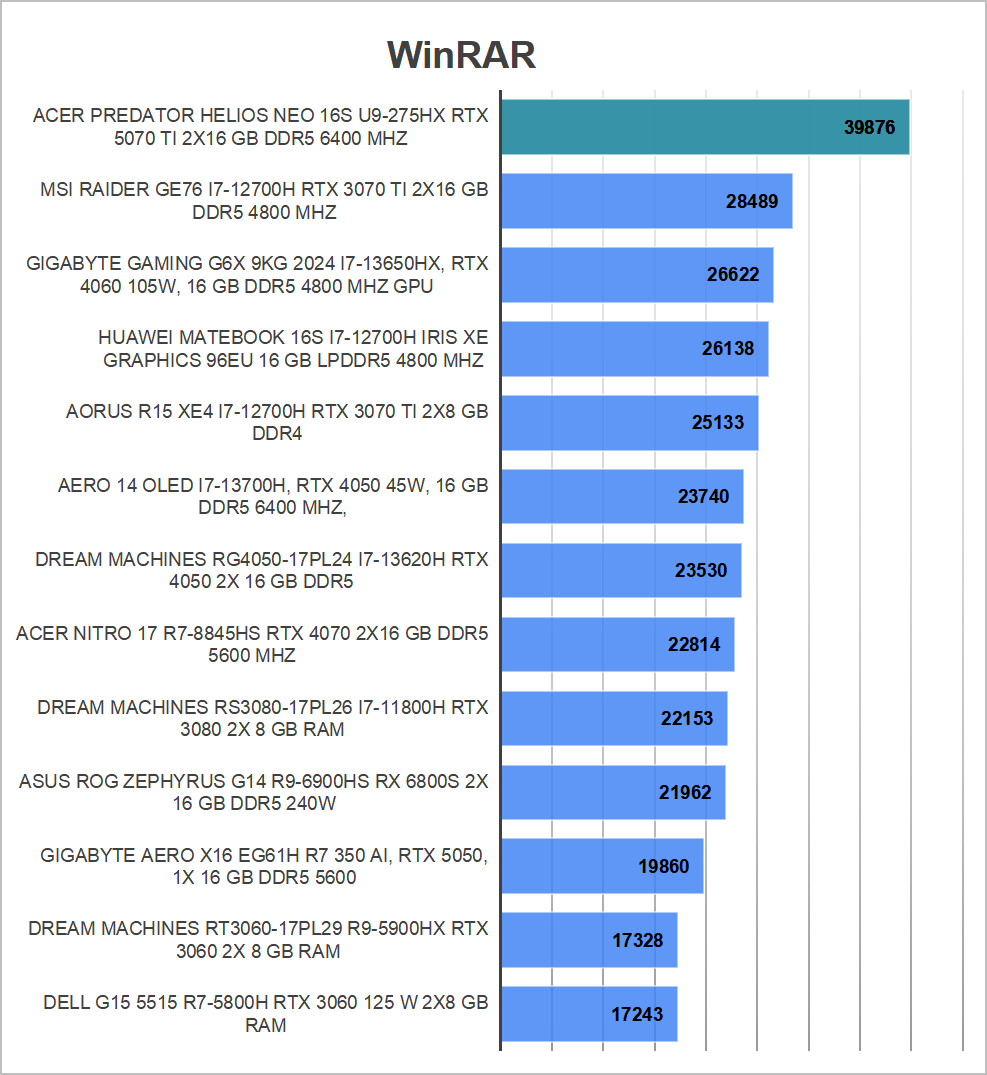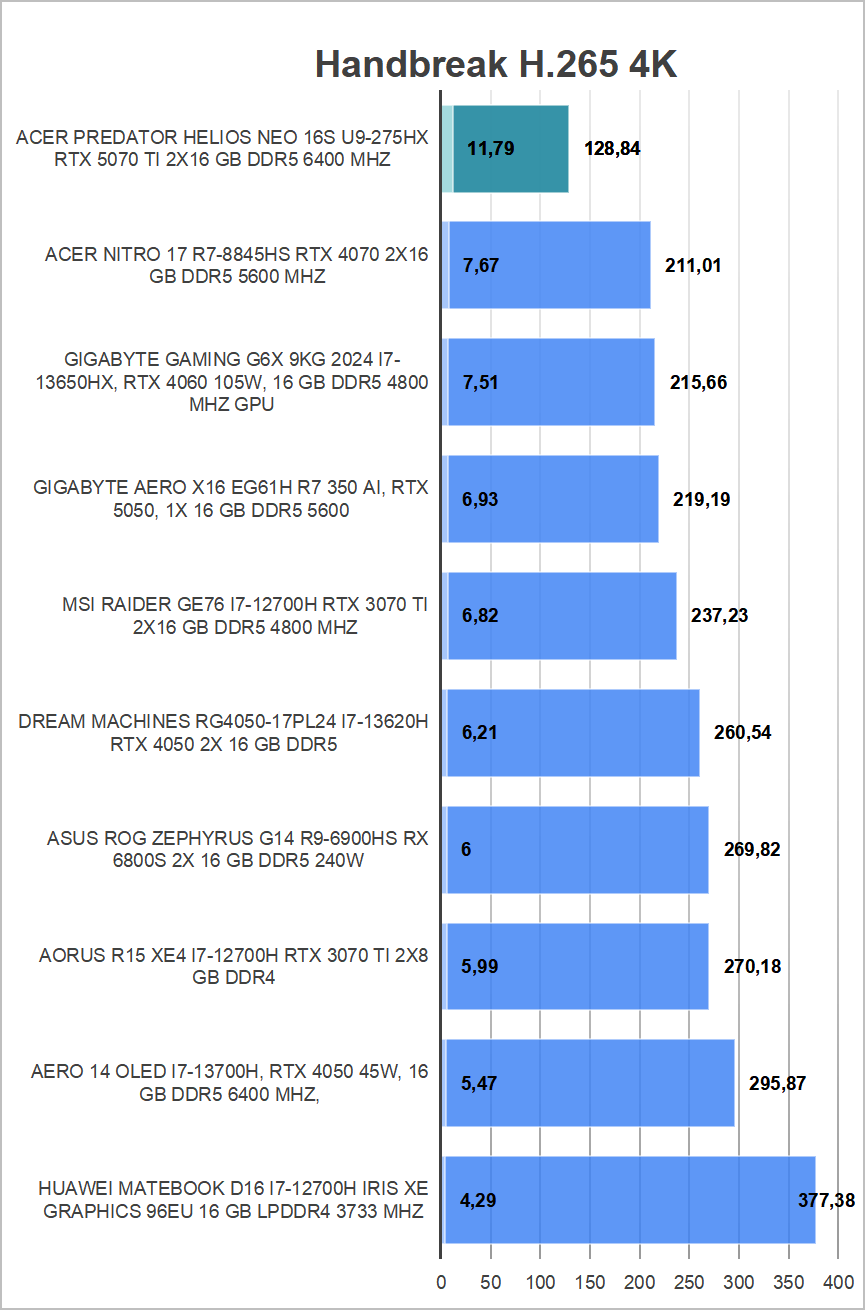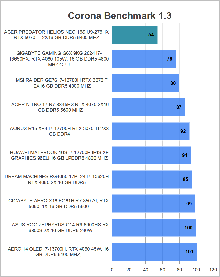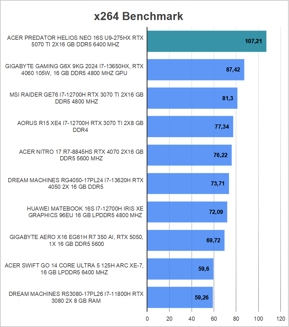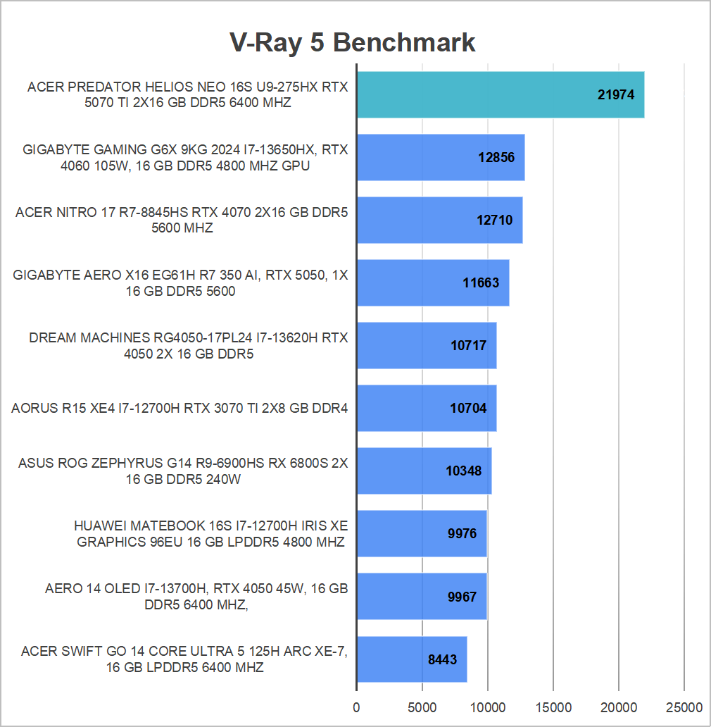 W zastosowaniach praktycznych procesor prezentuje się równie dobrze. W HandBrake H.265 i x264 Benchmark radził sobie z konwersją wideo z prędkościami odpowiednio 11,8 i 107 FPS, co plasuje go w czołówce laptopów z segmentu high-end. V-Ray i Corona Benchmark pokazują z kolei, że Predator Helios Neo 16S AI to sprzęt, który bez problemu poradzi sobie z renderingiem, a wynik ponad 21 000 punktów w V-Ray to poziom, którego jeszcze niedawno nie dało się osiągnąć w laptopach poniżej 20 tysięcy złotych.