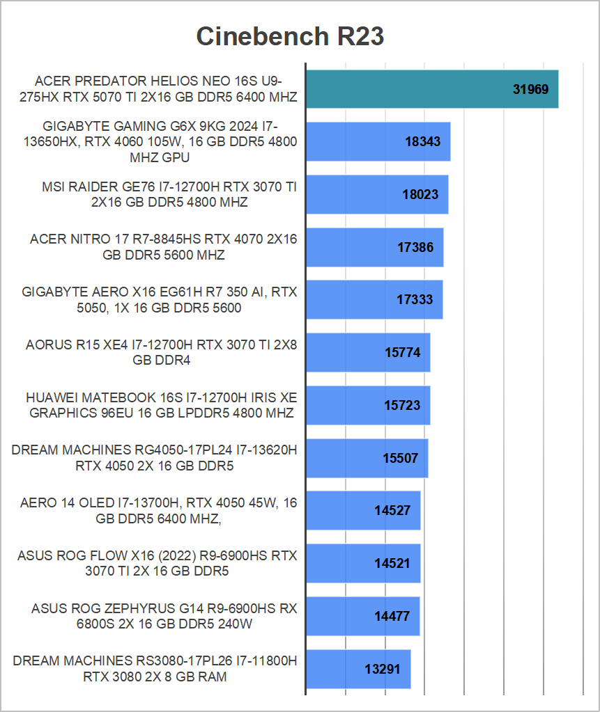 W praktyce przekłada się to na bardzo wysoką wydajność w każdym scenariuszu. W testach syntetycznych Cinebench R23 procesor uzyskał wynik ponad 31 000 punktów, co czyni go jednym z najmocniejszych CPU mobilnych na rynku. I nie ma co się dziwić, że to właśnie na układ Intela zdecydował się Acer.