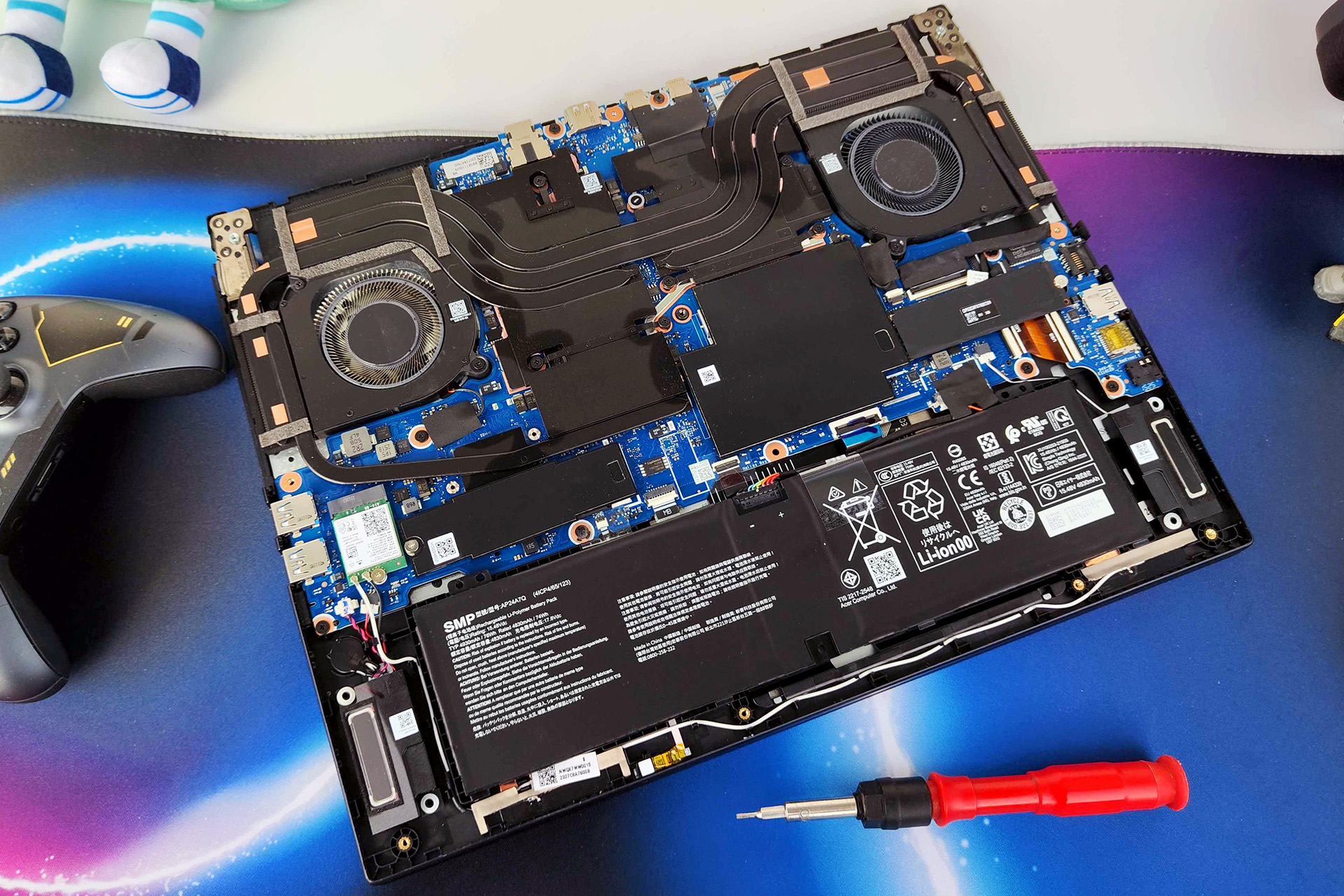 Zawsze lubię zajrzeć do wnętrza laptopa, by zobaczyć, jak został zbudowany. Niestety, coraz częściej producenci skutecznie ukrywają elektronikę pod warstwą radiatorów i osłon. Nie inaczej jest w przypadku Heliosa Neo 16S AI. Większość podzespołów przykrywają czarne odpromienniki, które nie tylko chronią delikatne komponenty, ale też kierują przepływ powietrza dokładnie tam, gdzie powinien trafić.