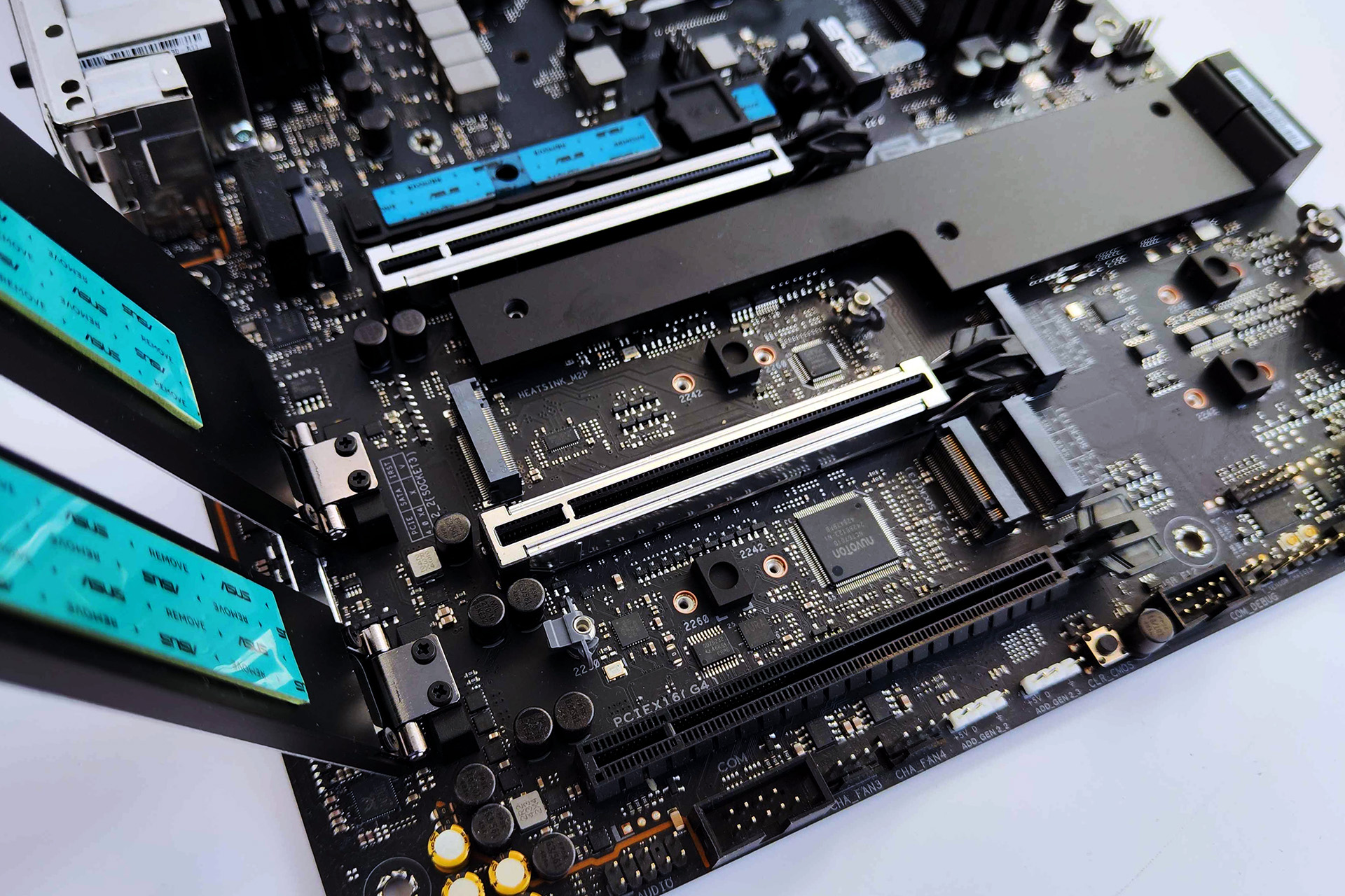Na płycie znajdziemy cztery gniazda DIMM, obsługujące łącznie do 192 GB pamięci DDR5. Co istotne, platforma wspiera nie tylko moduły UDIMM, ale także nowe CUDIMM. Entuzjaści docenią deklarowane wsparcie dla profili XMP i AEMP III, pozwalające na podkręcanie pamięci aż do 9066+ MT/s (OC). ASUS zaimplementował tu również swoje najnowsze technologie optymalizacyjne, takie jak DIMM Fit i DIMM Flex, które mają ułatwić osiągnięcie stabilności przy wysokich taktowaniach.