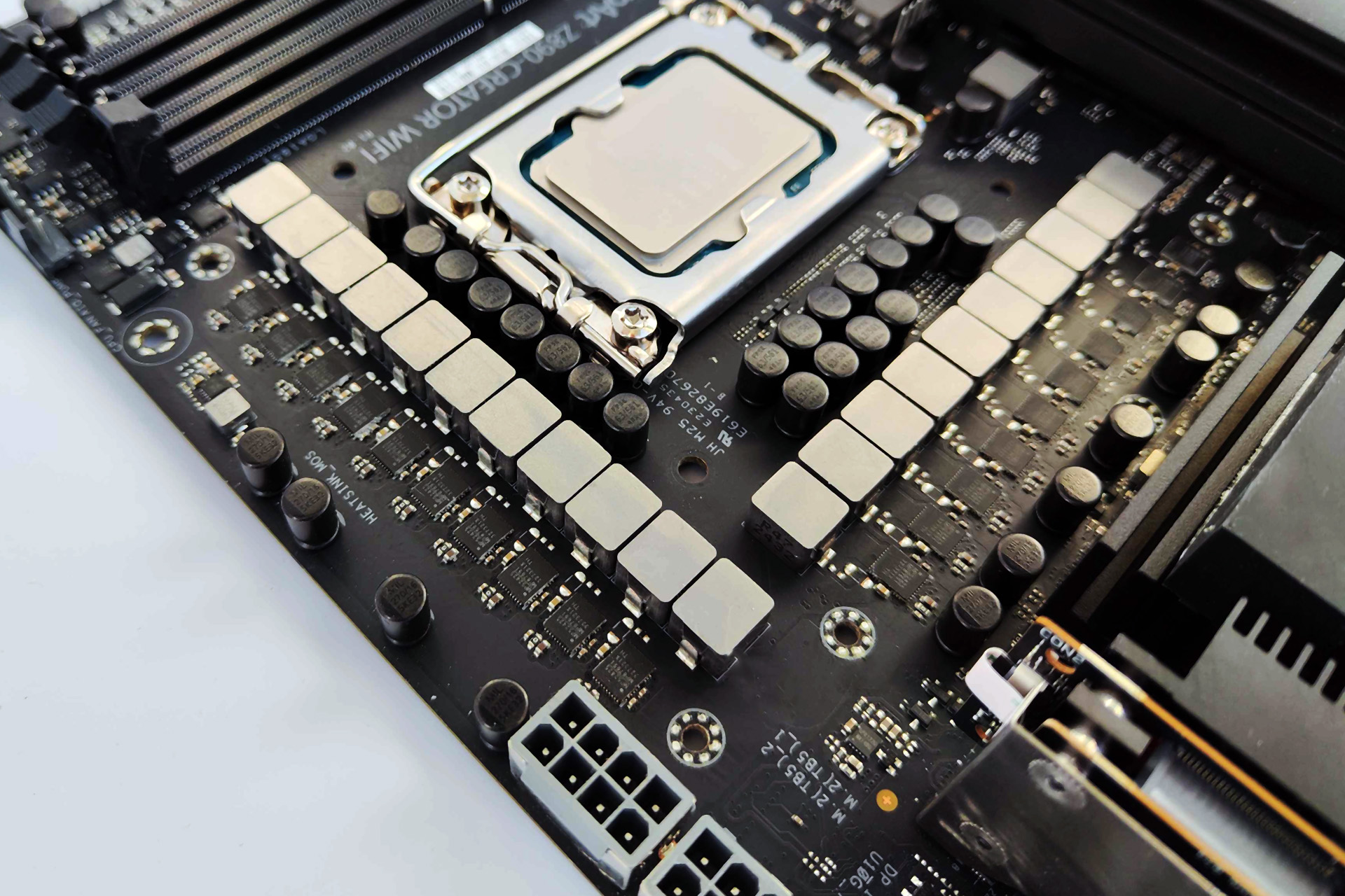 Przejdźmy do elementu kluczowego dla stabilności stacji roboczej – sekcji zasilania. ASUS nie szukał tu kompromisów. Mamy do czynienia z potężnym, cyfrowym układem zasilania w konfiguracji 16+1+2+2 faz. Szesnaście faz 90A (SPS) odpowiada za Vcore, jedna faza 90A (SPS) za VCCGT, dwie fazy 90A (SPS) za VCCSA i dwie fazy 80A (SPS) za VCCNAON. Taki zestaw bez najmniejszego problemu poradzi sobie z długotrwałym, maksymalnym obciążeniem generowanym przez topowe procesory Intel Core Ultra (seria 2) podczas wielogodzinnych renderingów. Energię dostarczają dwa 8-pinowe złącza EPS, a ciepło z sekcji odprowadzają masywne radiatory VRM.