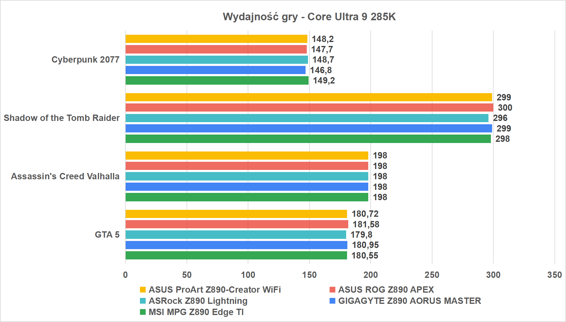W samych grach, w rozdzielczościach 1080p, różnice są marginalne. W tytułach takich jak Assassin’s Creed Valhalla czy Shadow of the Tomb Raider wydajność jest praktycznie identyczna z najdroższymi płytami gamingowymi. W Cyberpunk 2077 i GTA 5 różnice są na poziomie 1-2 klatek, co mieści się w granicach błędu pomiarowego.