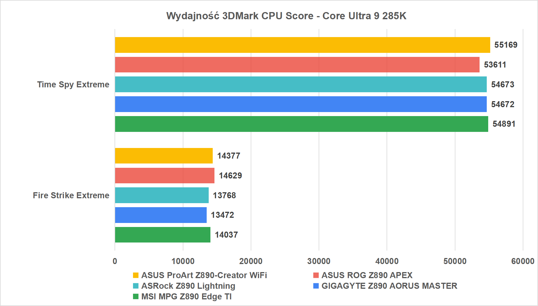 Przejdźmy teraz do testów w benchmarkach 3D, które symulują obciążenie typowe dla gier, ale także dla renderingu na GPU. Tutaj ProArt Z890-CREATOR WIFI ponownie udowadnia, że jest to konstrukcja bezkompromisowa. W teście Time Spy Extreme model ten uzyskał najwyższy wynik w całej stawce, notując 55169 punktów. W Fire Strike Extreme również zajął doskonałe, drugie miejsce, tuż za APEXem.