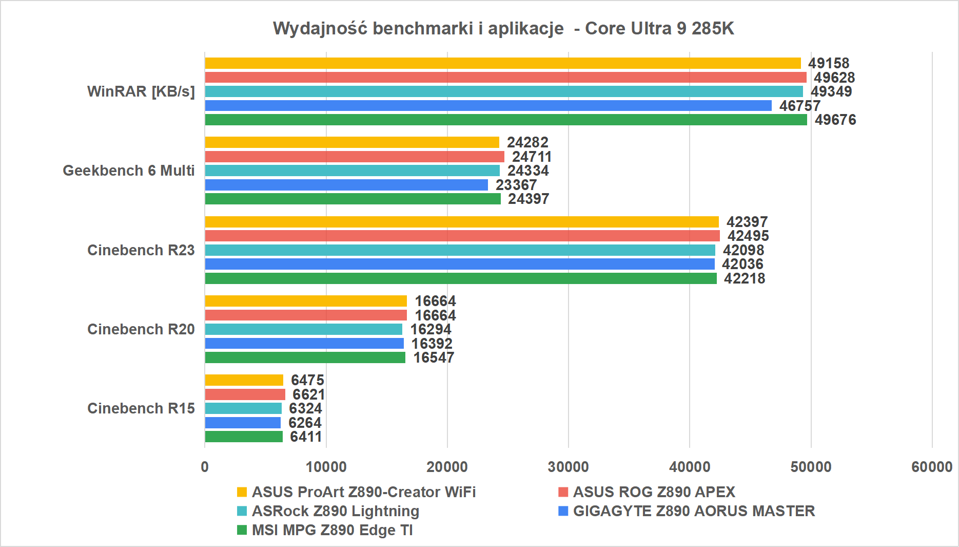 W testach czystej mocy obliczeniowej CPU, takich jak Cinebench R20 i R23, płyta ProArt plasuje się w absolutnej czołówce. W R20 (16664 pkt) zanotowała identyczny wynik jak APEX, a w R23 różnica do pierwszego miejsca jest pomijalna (mniej niż 0,25%). To dobitnie pokazuje, że potężna sekcja zasilania i dopracowany BIOS przekładają się na realną, topową wydajność w zastosowaniach wielordzeniowych. W pozostałych testach, jak Geekbench 6 czy WinRAR, wyniki są bardziej wyrównane, jednak ProArt niezmiennie utrzymuje się w ścisłej czołówce.