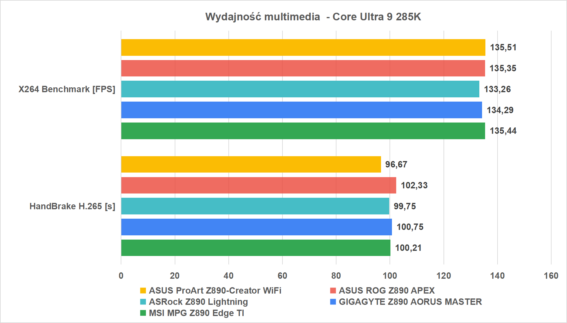 W kluczowych dla twórców testach kodowania wideo model ASUSa okazuje się być liderem. W teście HandBrake H.265, gdzie liczy się każda sekunda, ProArt (96,67 s) wyraźnie wyprzedził konkurencję. Co ciekawe, przeznaczony do bicia rekordów model APEX okazał się tu najwolniejszy. Podobnie w benchmarku X264, ProArt (135,51 FPS) zanotował najwyższy wynik, nieznacznie wyprzedzając MSI (135,44 FPS) i APEX (135,35 FPS).