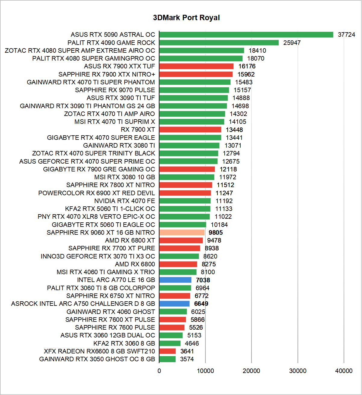 Testy 3D rozpoczniemy od syntetycznych benchmarków. Teoretycznie jedynymi testami syntetycznymi 3DMark niezależnymi od procesora są Port Royal i Speedway. Sprawdzają one również wydajność układów w obliczeniach śledzenia promieni (Ray Tracing). Wyniki z testów Time Spy oraz Fire Strike w ustawieniach Extreme pokazują tylko rezultat osiągany przez samą kartę graficzną, tak zwany „GPU Score”.