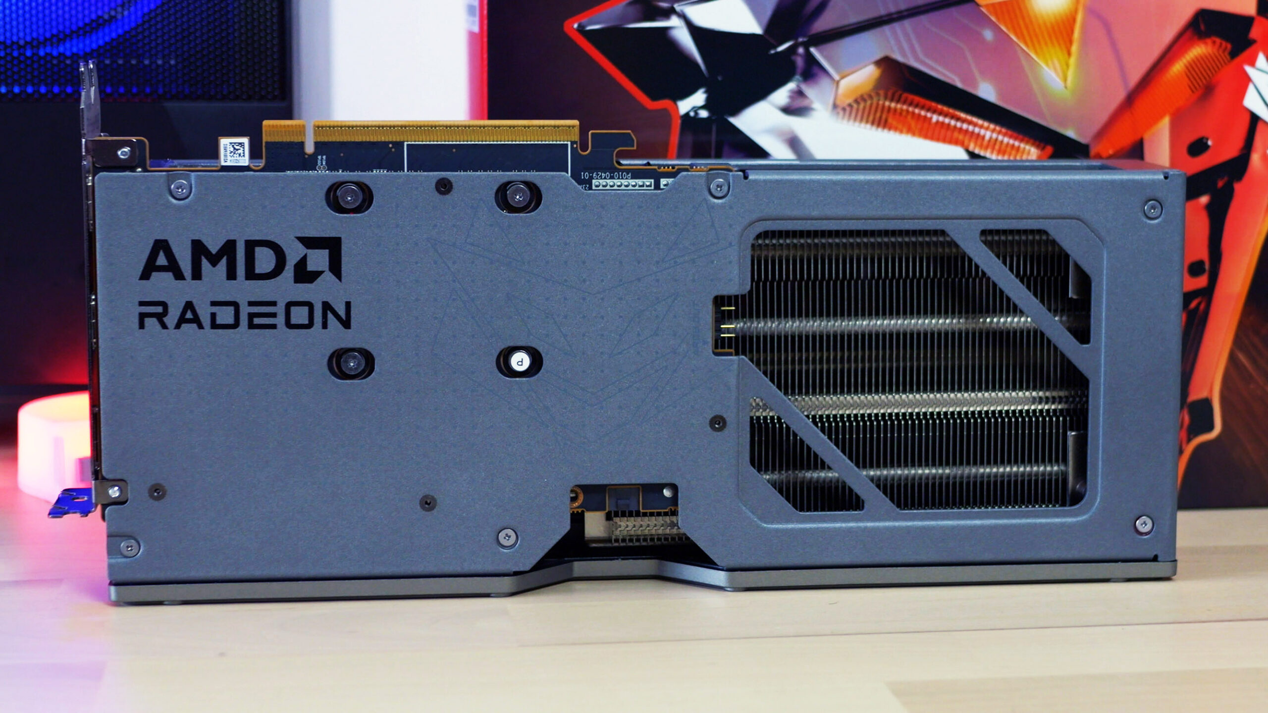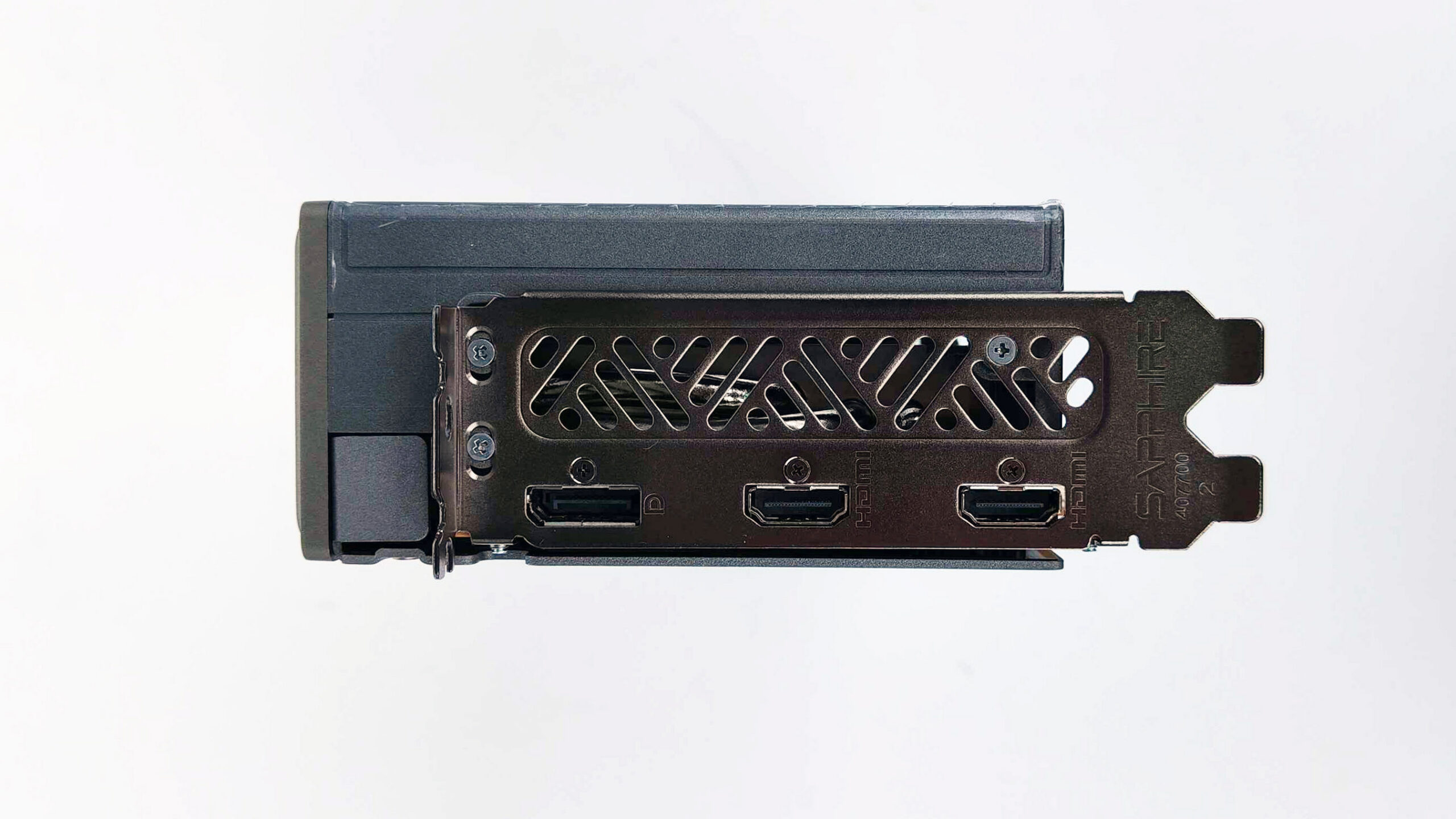 Małym zaskoczeniem jest panel I/O, gdzie umieszczono porty VIDEO. Na śledziu znajdziemy zestaw 2× HDMI 2.1 oraz 1× DisplayPort 2.1a. Mało, i trochę dziwi decyzja AMD o okrojeniu ilości złącz do podłączenia ekranu w przypadku RX 9060 XT. Przecież nawet tani RX 7600 miał 4. No cóż, to nie jedyne cięcia, jakie zauważymy w przypadku nowej karty od czerwonych.