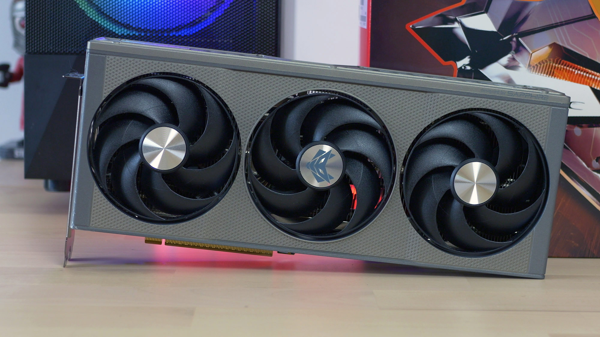 Karta zajmuje fizycznie trzy sloty PCIe, w naszej obudowie a jej długość to ok. 30 cm. System chłodzenia Tri-X składa się z trzech wentylatorów z łopatkami AeroCurve, które redukują opór powietrza i zwiększają efektywność chłodzenia. Radiator został zaprojektowany z myślą o optymalnym przepływie powietrza, co wspomaga efektywne odprowadzanie ciepła. Obudowa wentylatorów wykonana jest z tworzywa sztucznego, natomiast tył karty zdobi metalowy backplate, który nie tylko usztywnia konstrukcję, ale również pomaga w rozpraszaniu ciepła. Dodatkowo karta wyposażona jest w podświetlane logo SAPPHIRE z możliwością synchronizacji RGB, co pozwala na personalizację wyglądu zgodnie z preferencjami użytkownika.