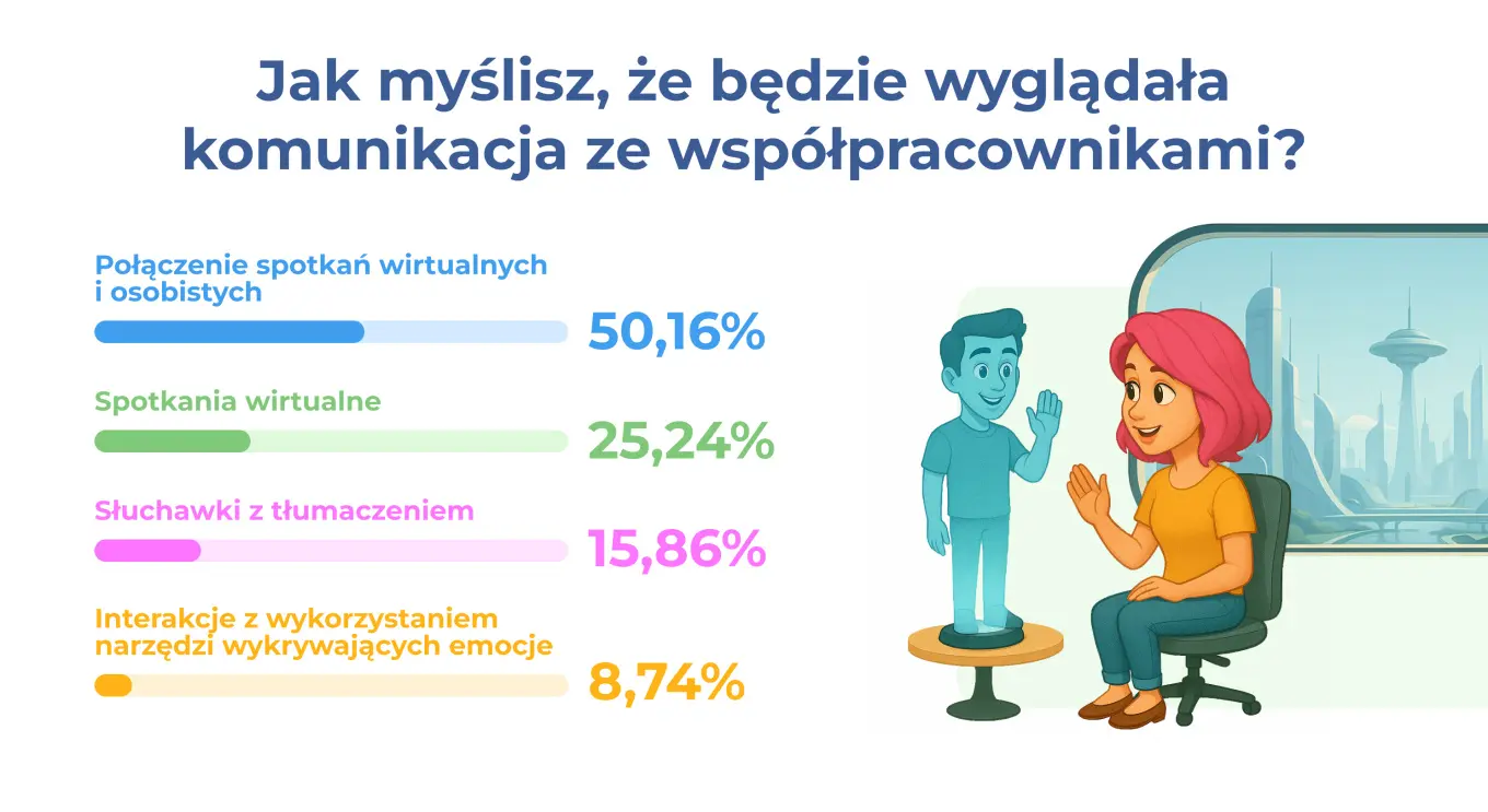 Wyobraź sobie, że budzisz się w 2050 roku. Twoja kawa smakuje tak samo, ale droga do „biura”? To już zupełnie inna bajka! Zamiast stać w korku, zakładasz gogle VR, a Twoi koledzy z zespołu to zarówno ludzie z całego świata, jak i zaawansowana sztuczna inteligencja. Brzmi jak scenariusz filmu science fiction? A co jeśli powiem Ci, że te wizje są bliżej niż myślisz?