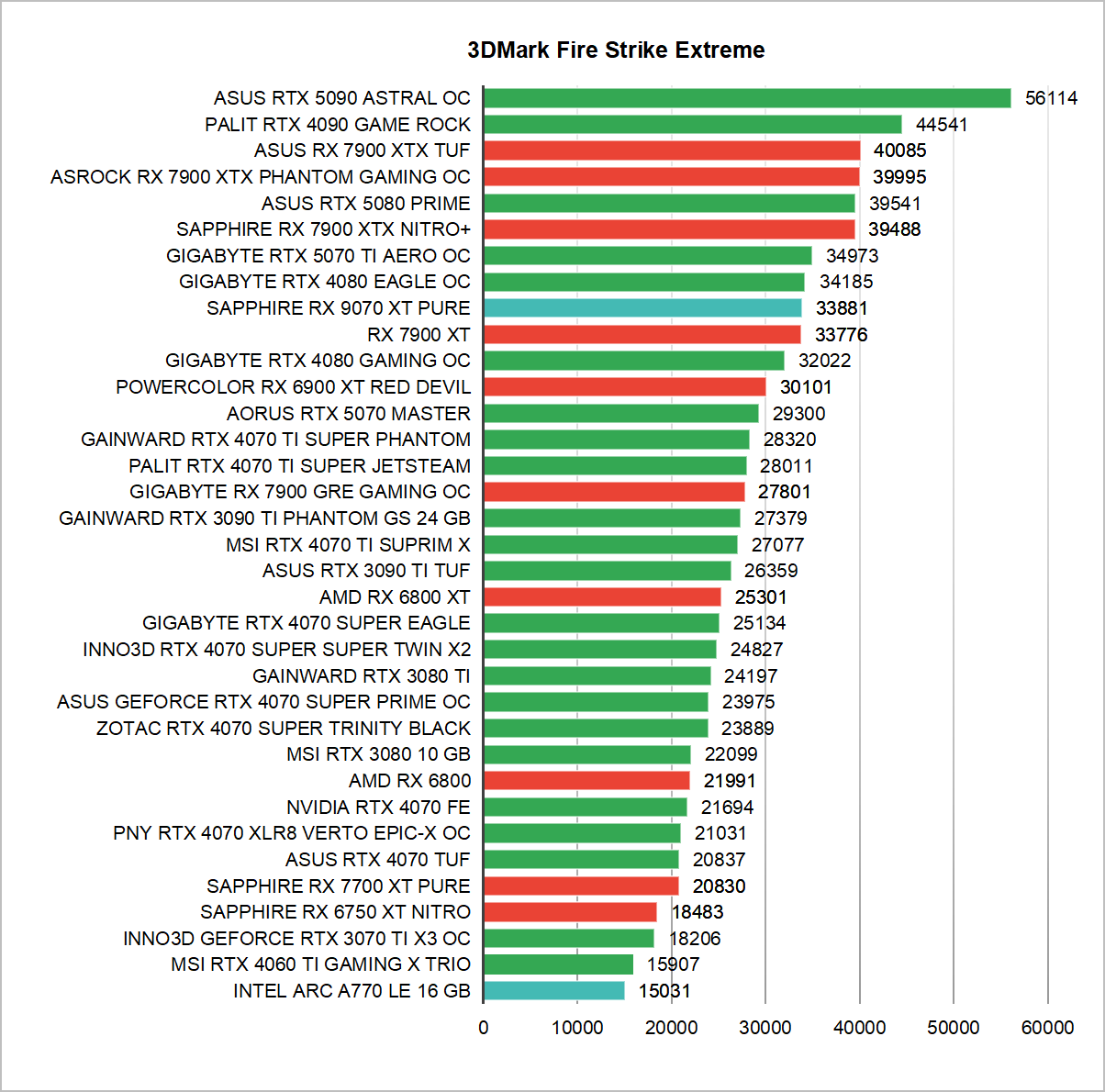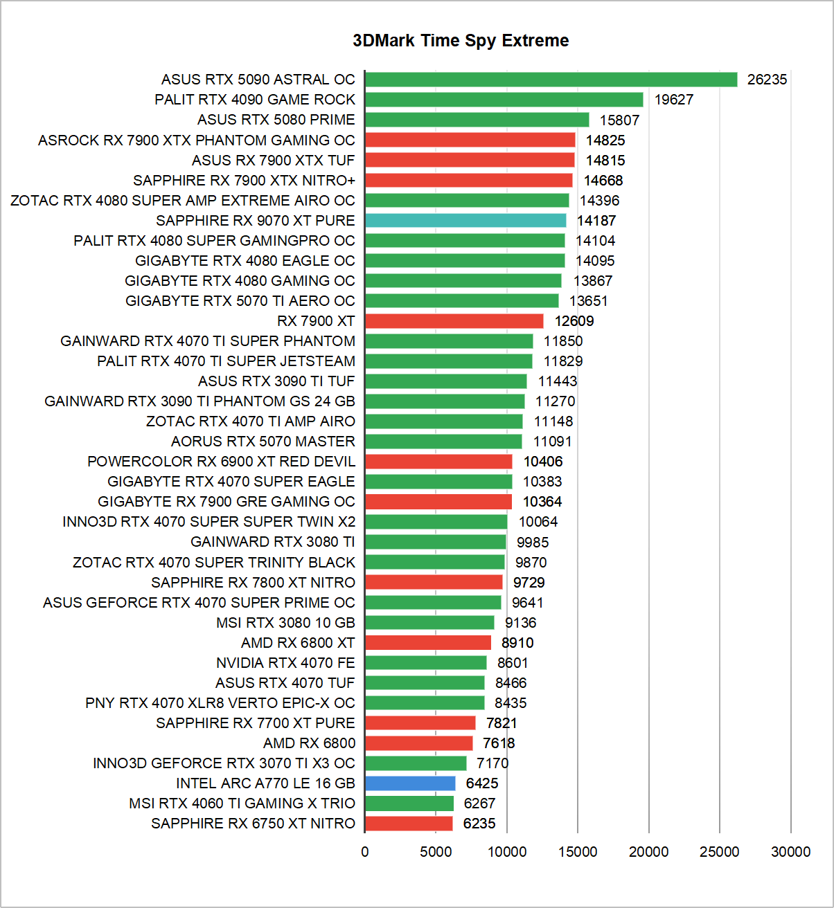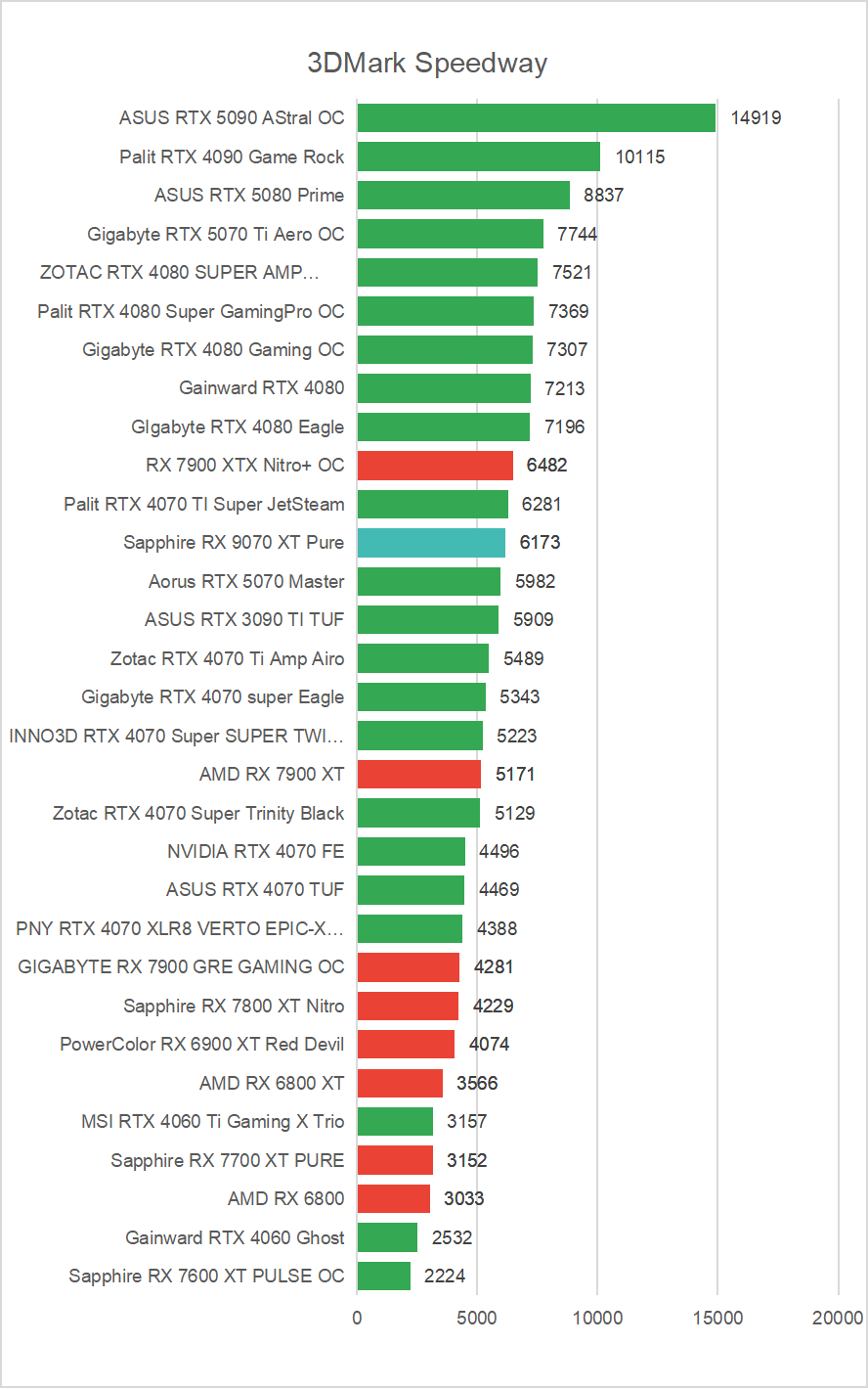 Pierwsza niespodzianka? I to jaka! Patrząc na wyniki nie trudno odnieść wrażenia za 9070 XT powinien rywalizować nie z RTX 5070, a jego droższą wersją z dopiskiem TI. Tak naprawdę najbardziej wyrównaną rywalizację zauważamy tylko w teście SpeedWay, który to dość mocno wykorzystuje Ray Tracing, a mimo to Radeon i tak jest w nim szybszy o kilka procent.
