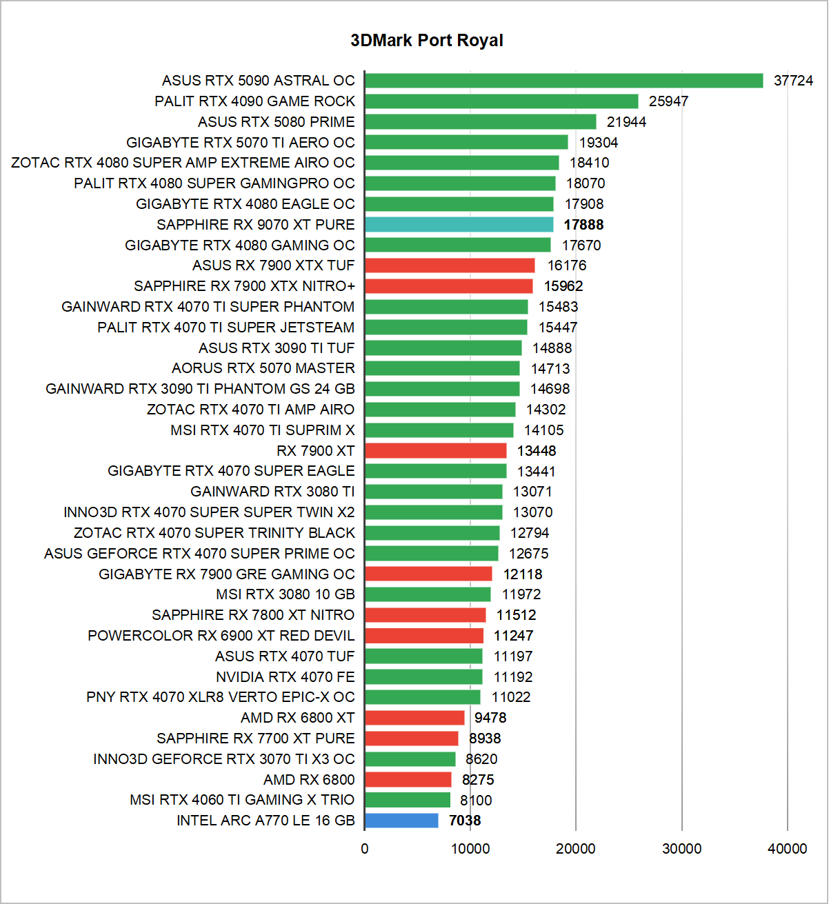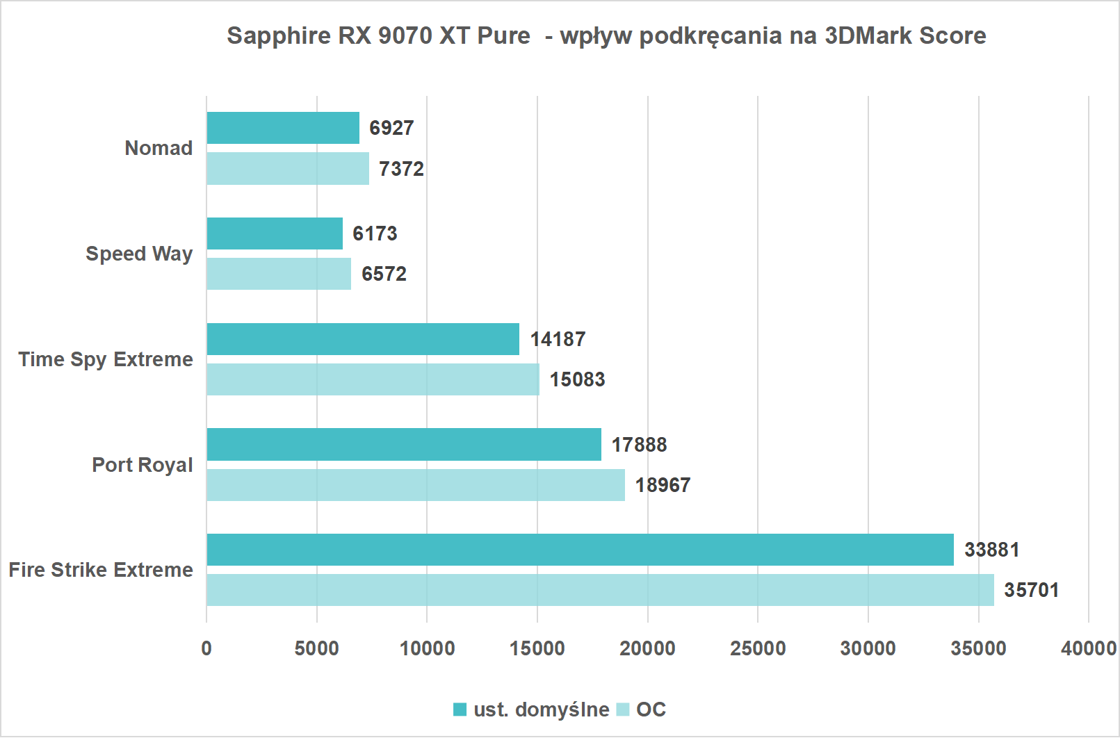 Dzięki tym ustawieniom zyskałem dodatkowe 1000 pkt w Port Royal. Jednak dużo bardziej imponujące są wyniki osiągnięte w pozostałych testach 3Dmarka. Dzięki OC udało się prześcignąć w testach Nomad, Time Spy czy Fire Strike, RTX 5070 Ti. Tylko w bazujących na RayTracingu benchmarkach karta NVIDII pozostała szybsza.